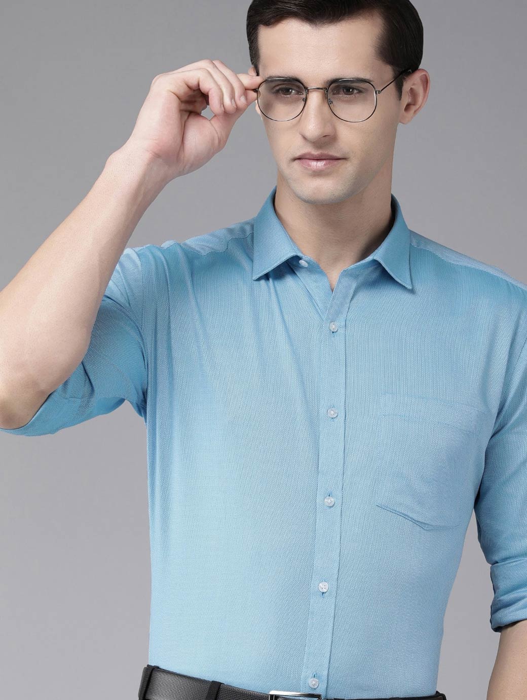 Blue solid opaque Formal shirt ,has a spread collar, button placket, 1 patch pocket, long regular sleeves, curved hem