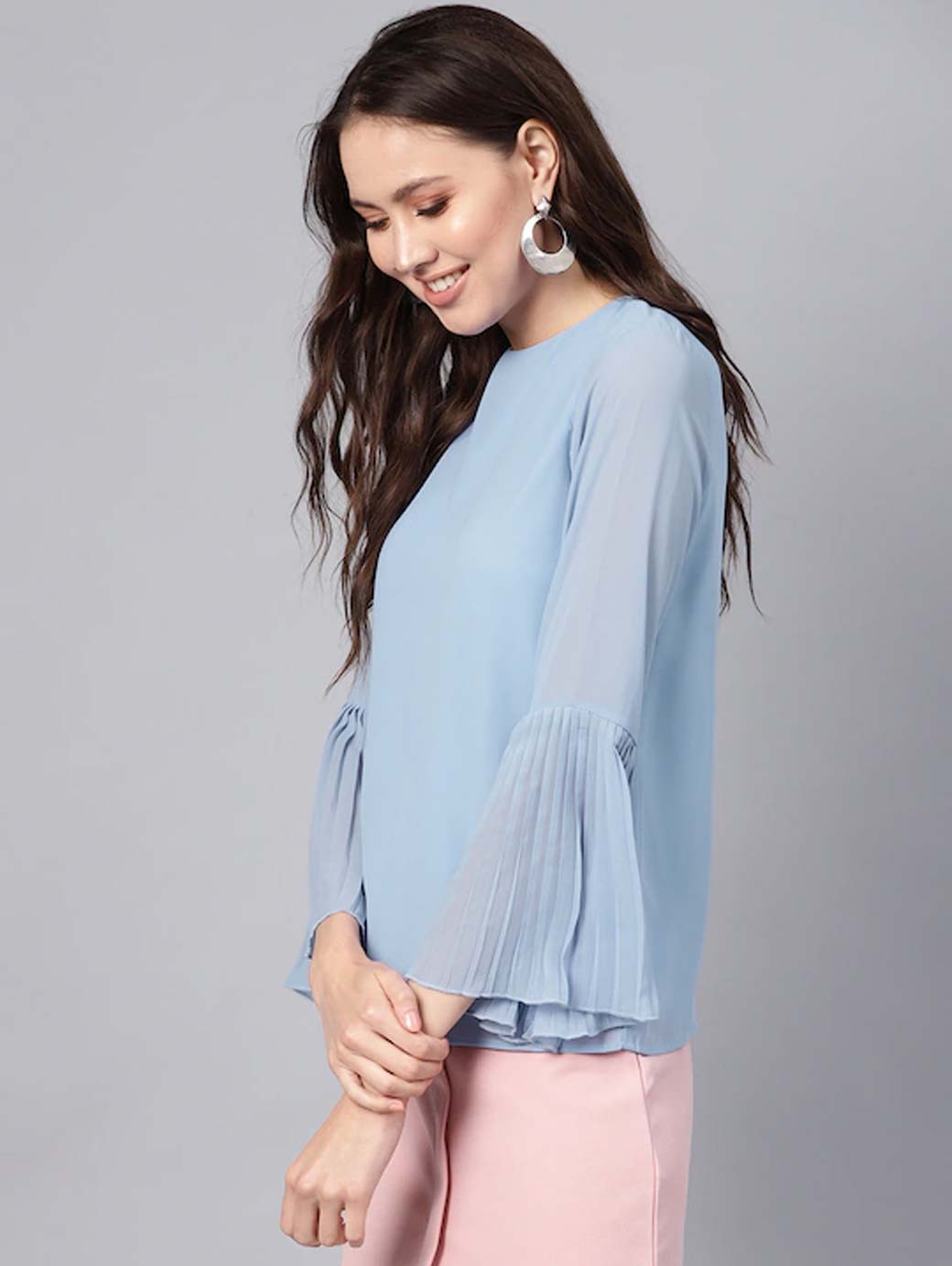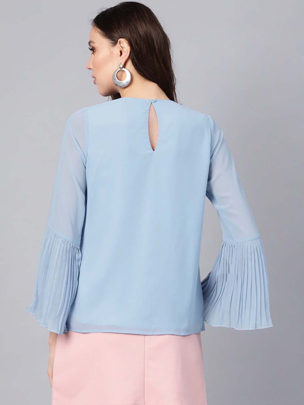 Blue solid woven regular top, has a round neck, long sleeves, and button closure