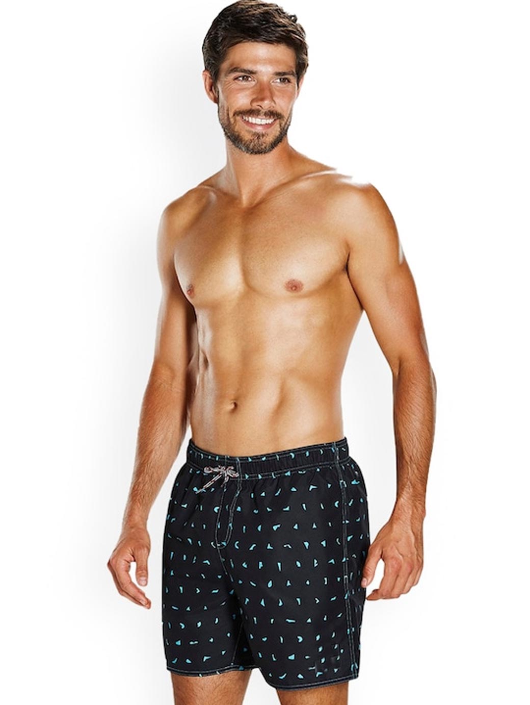 Black printed swim bottoms, has an elasticated waistband with drawstring closure