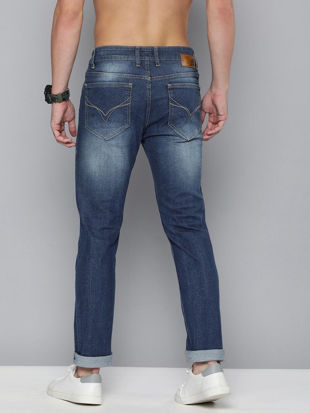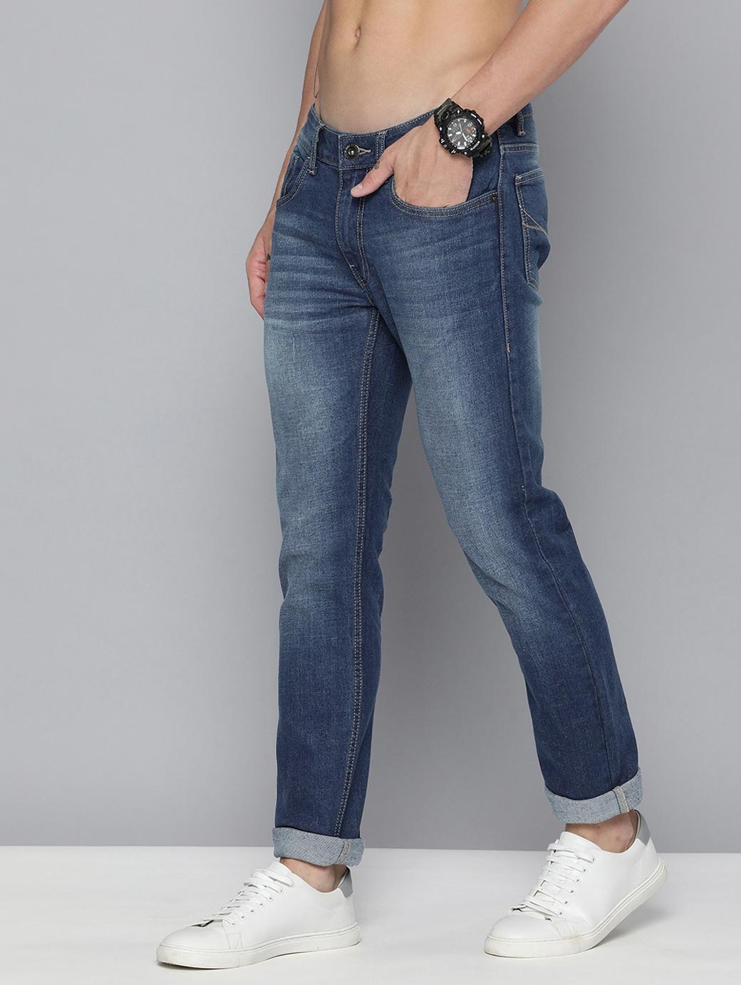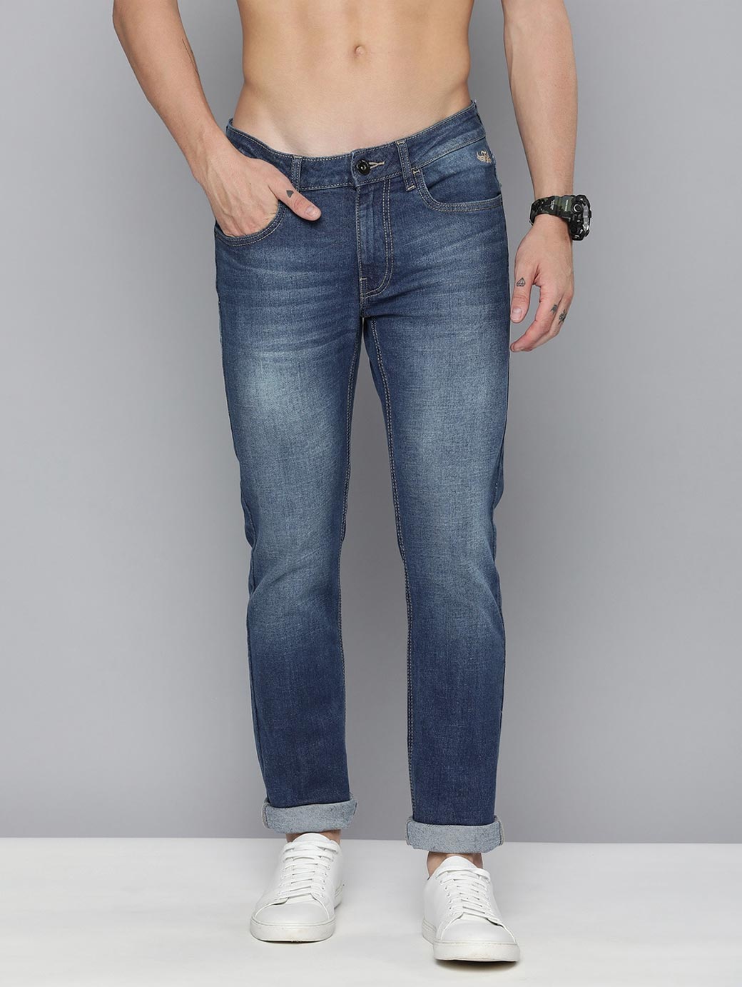 - Medium shade, heavy fade blue jeans