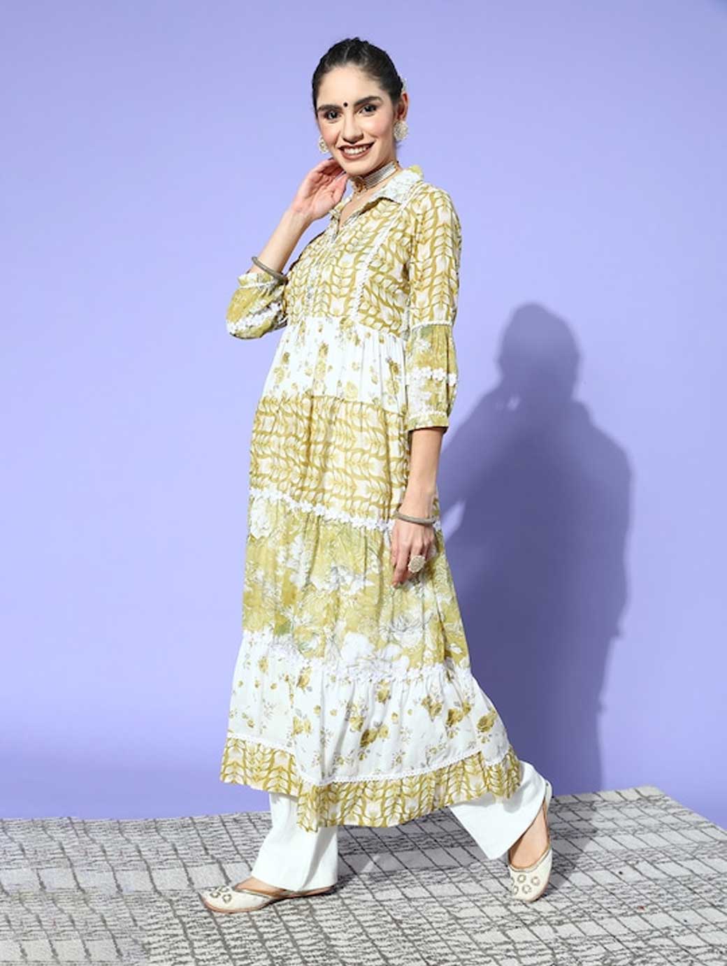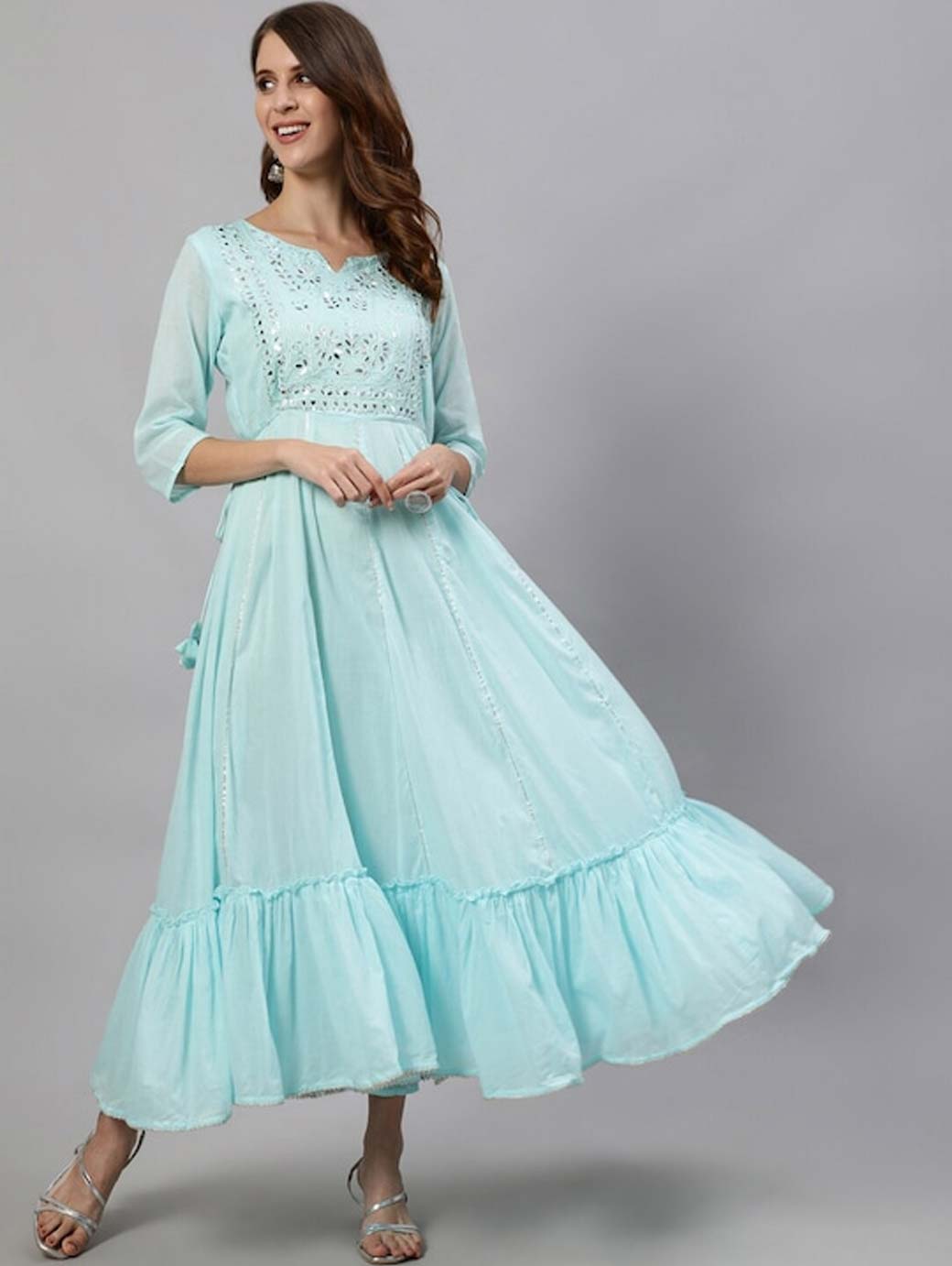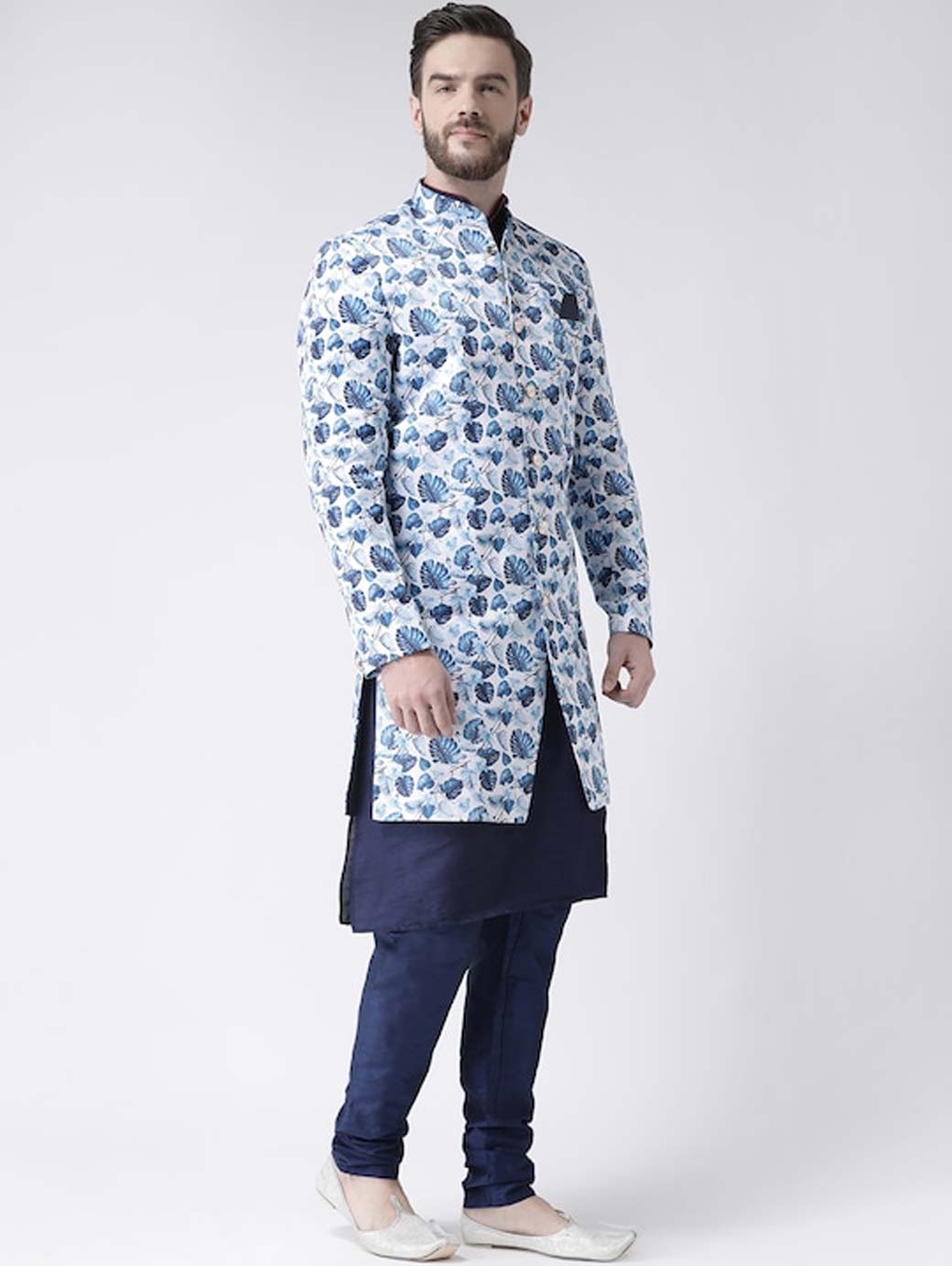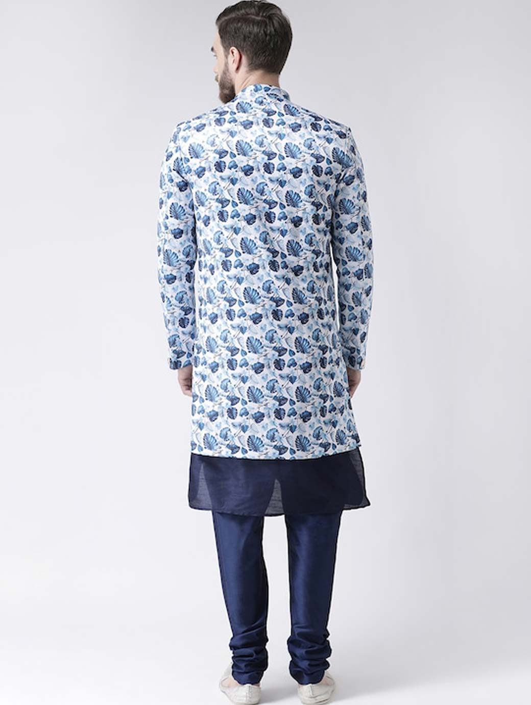 Blue and white printed achkan with blue solid kurta and churidar Blue and white printed achkan, has a mandarin collar, long sleeves, a full button placket, asymmetric hem, and multiple slits Blue solid kurta, has a mandarin collar, a short button placket, long sleeves and side slits Comes with a pocket square Blue solid churidar, has a drawstring closure Disclaimer: Pocket square color can vary from the images