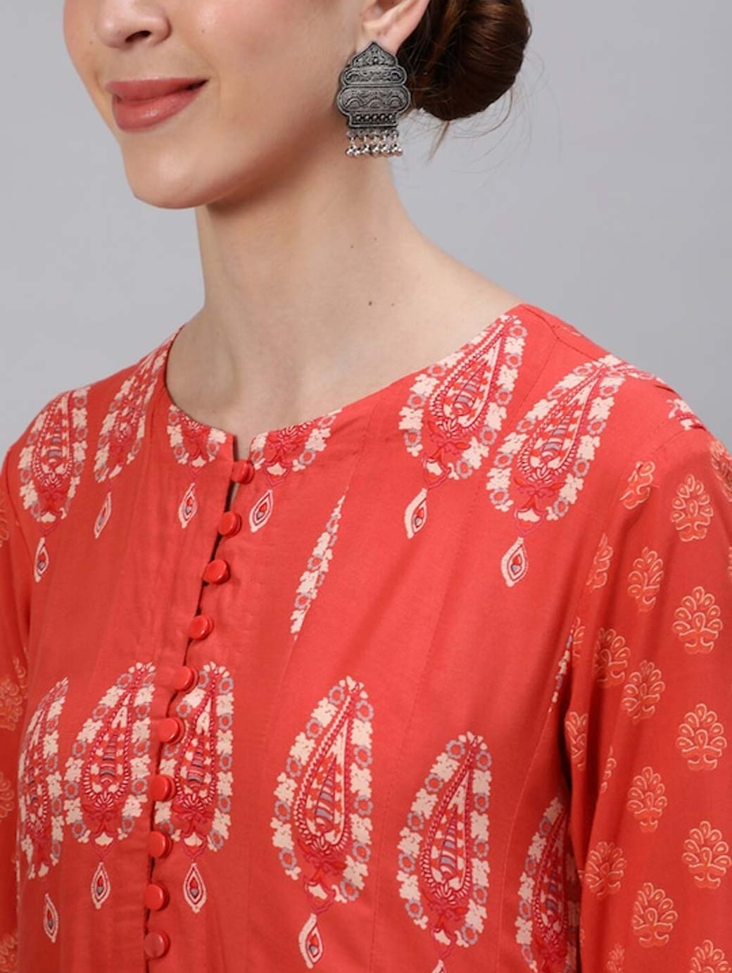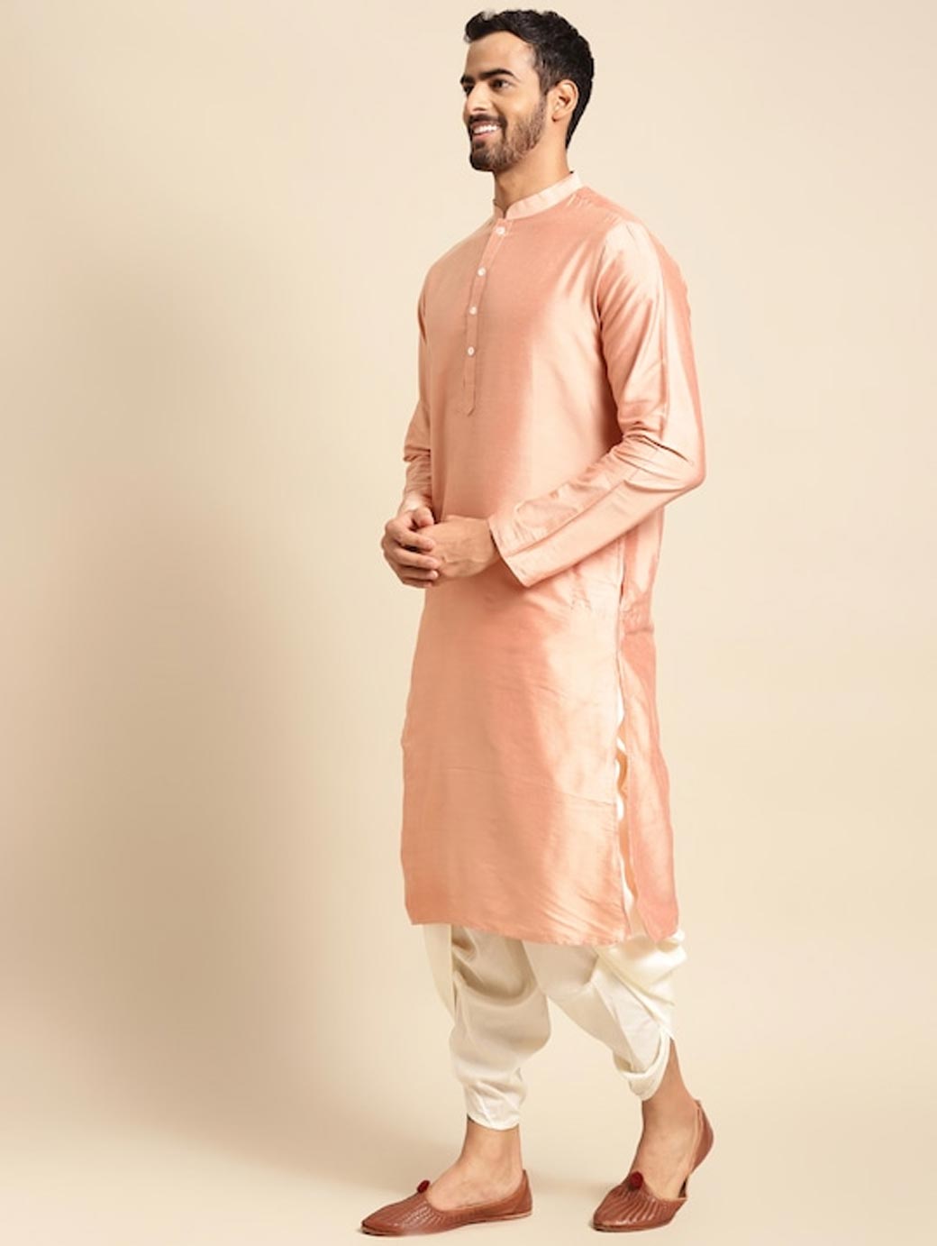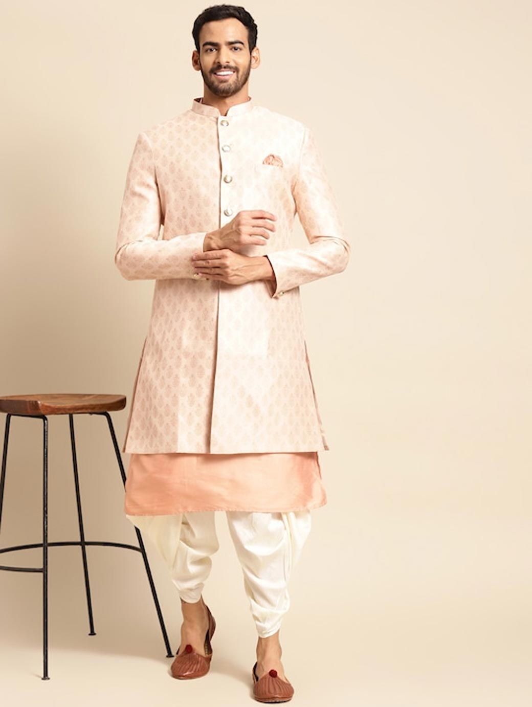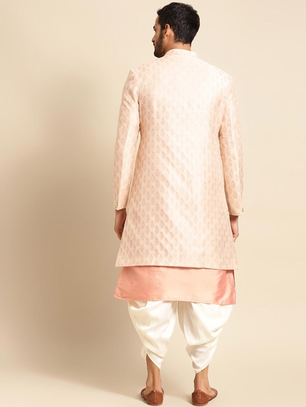 Golden Woven Design Kurta Sherwani Set Golden woven design Sherwani, has a mandarin collar, a button placket, long sleeves, straight hem, multiple slits Coral pink solid kurta, has a mandarin collar, button closures on the front, side slits Golden solid dhoti pants, has drawstring closure