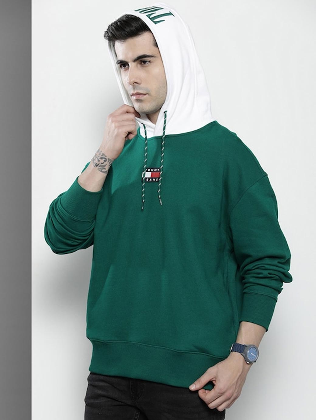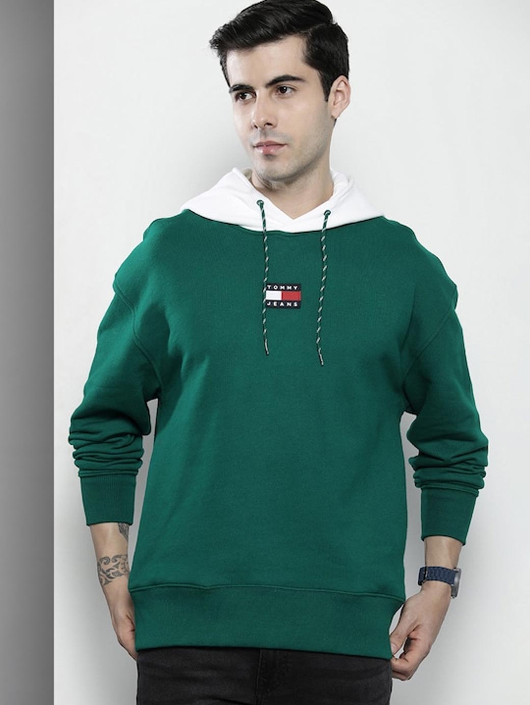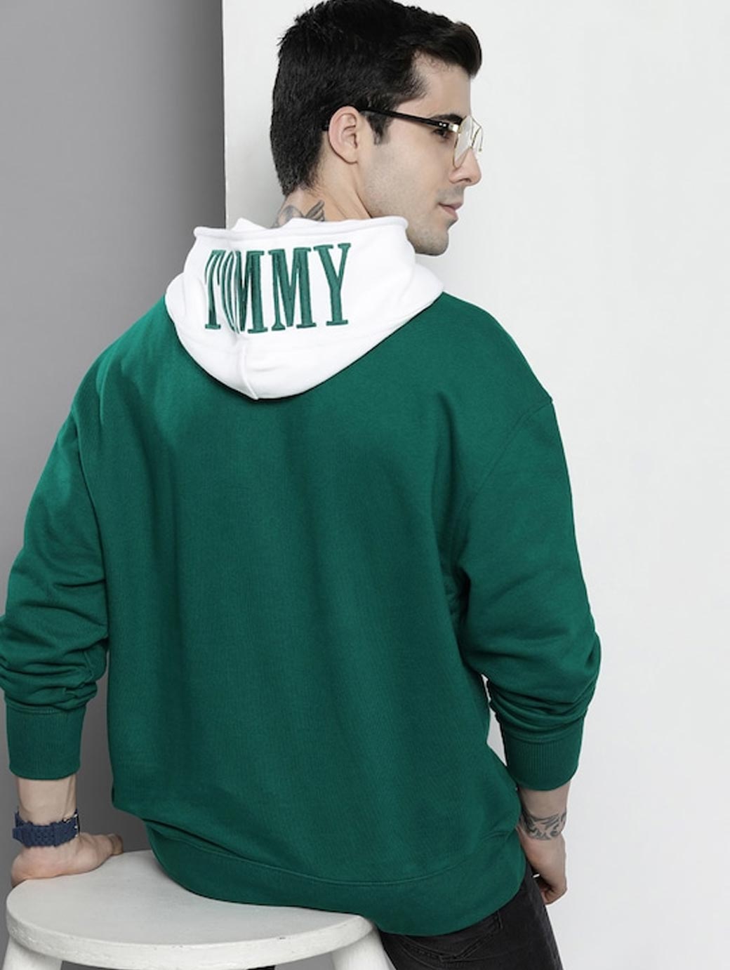 Green solid sweatshirt has a hooded, brand logo applique,1 kangaroo pocket , long sleeves, zip closure, straight hem