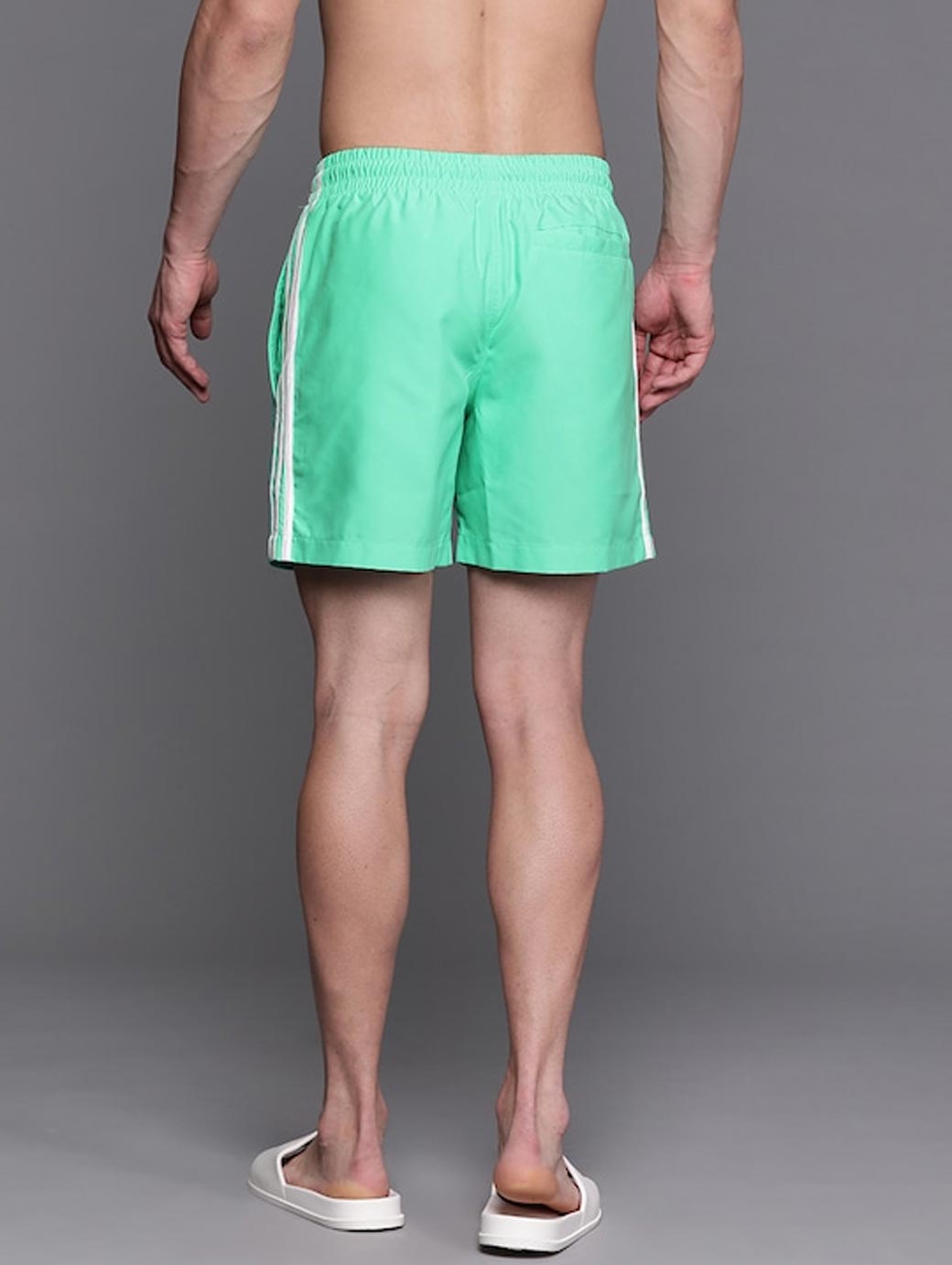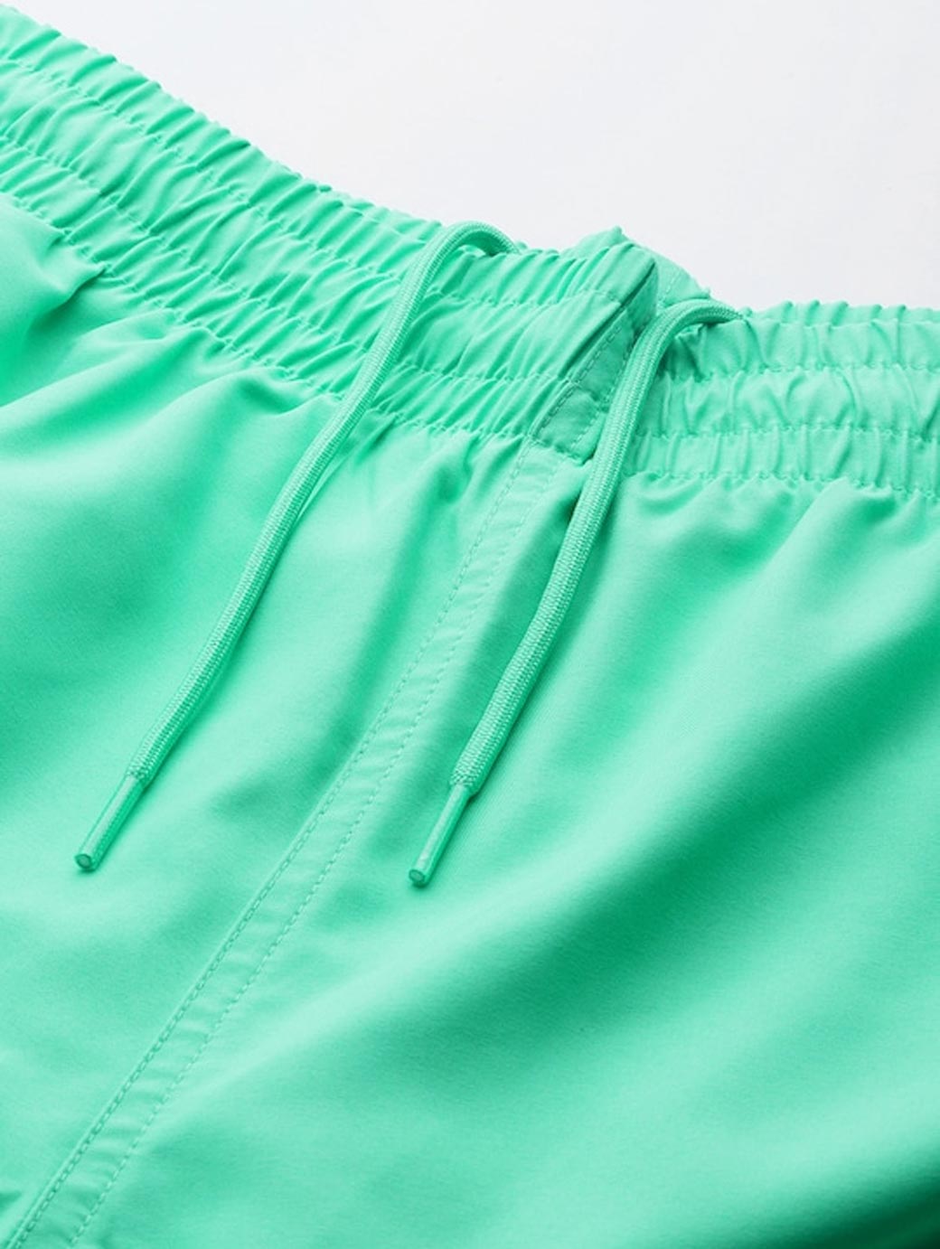 Special technologies These swim shorts are made with recycled polyester to save resources and decrease emissions Product design details Green solid swim shorts Elastic waist with Drawstring closure 100% recycled polyester plain weave Comfortable swim shorts Mesh inner briefs 2 Side pockets, 1 back pocket