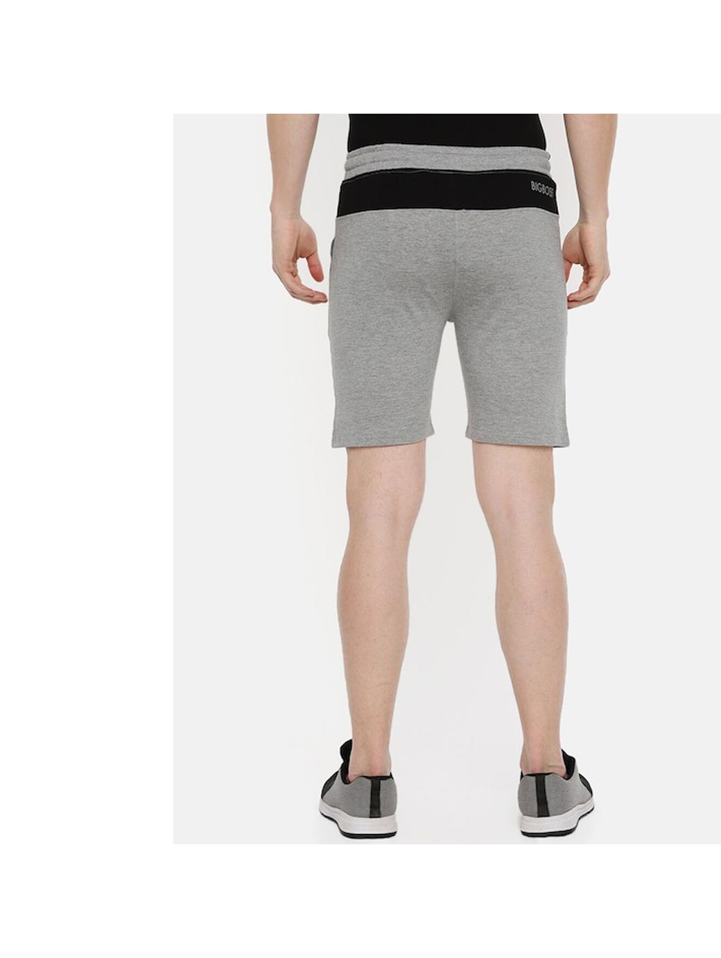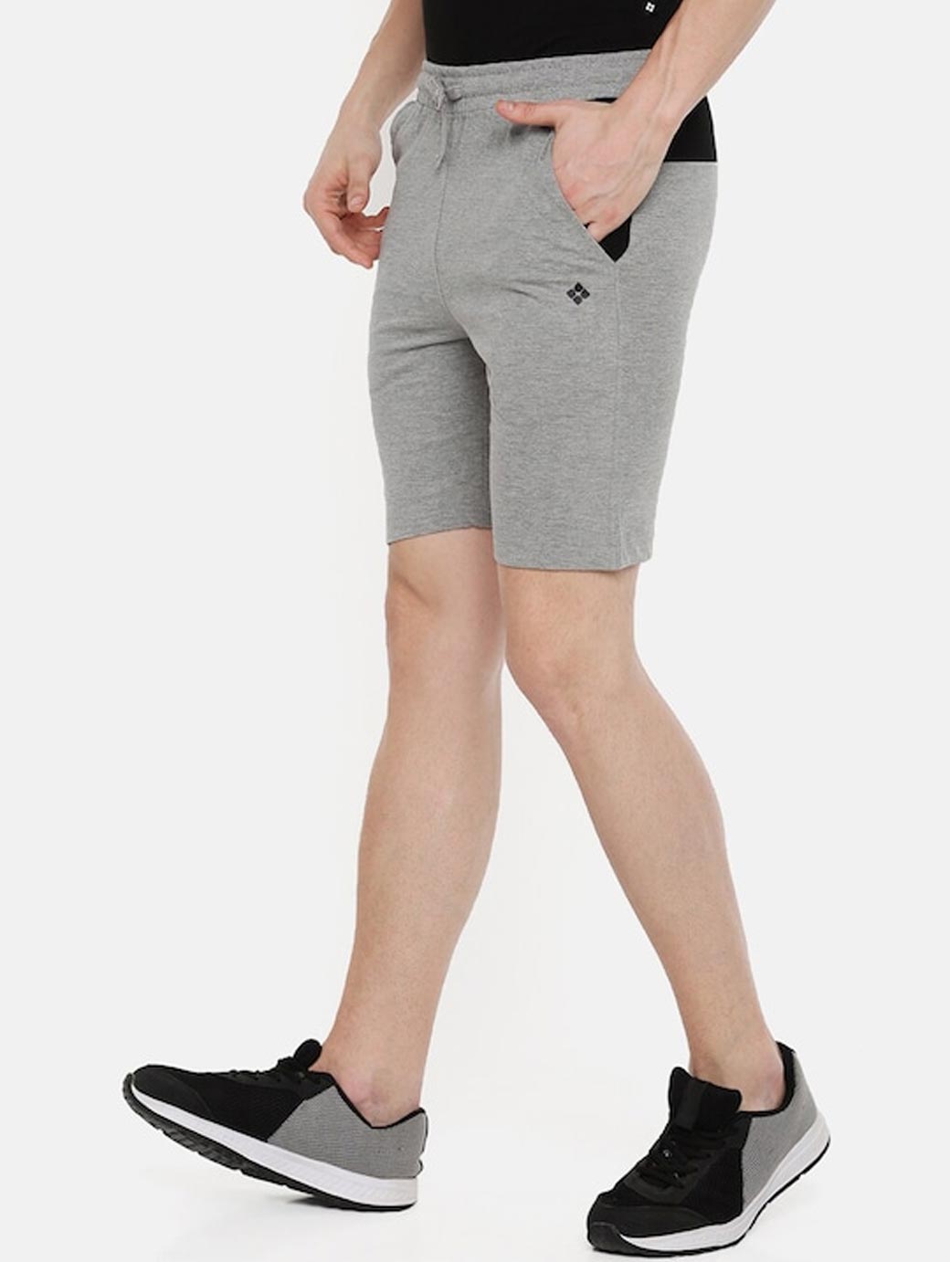 A pair of grey melange mid-rise solid knitted lounge shorts, has inner elastic waistband, drawstring closure, and 2 pockets