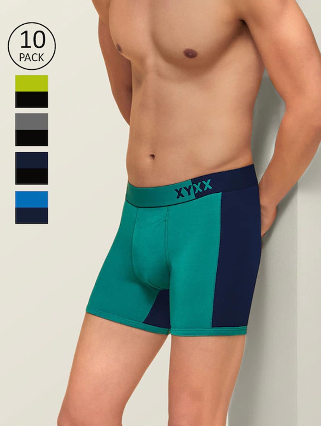 Pack of 10 trunks in Lime yellow, Blue, Navy, Green & Grey with contoured front pouch and anti-microbial finish that prevents odours and rashes.