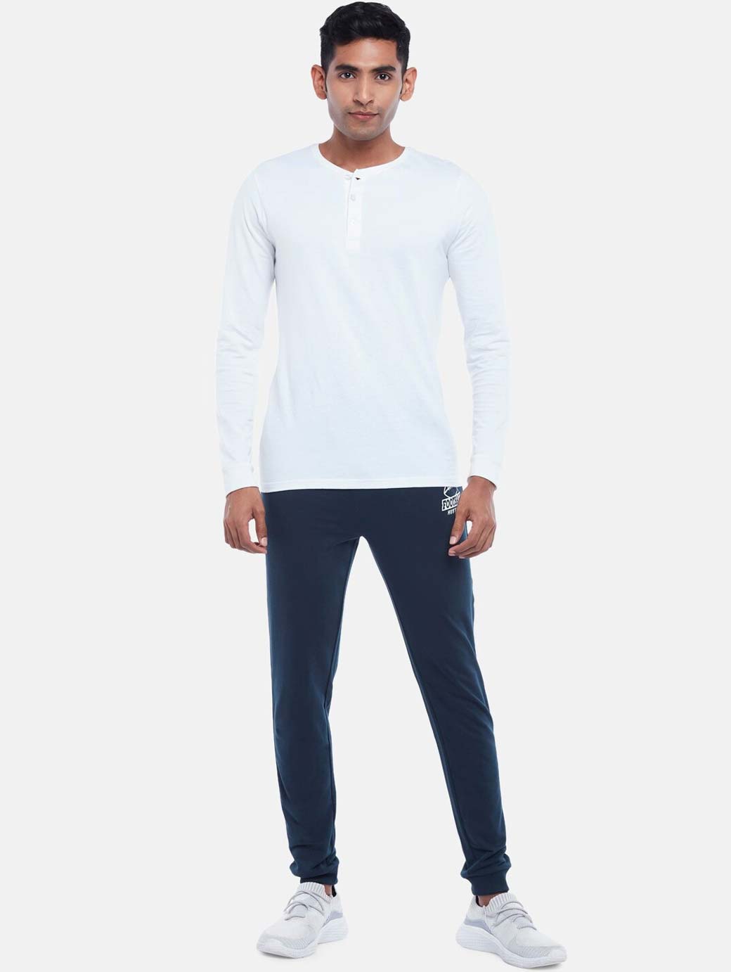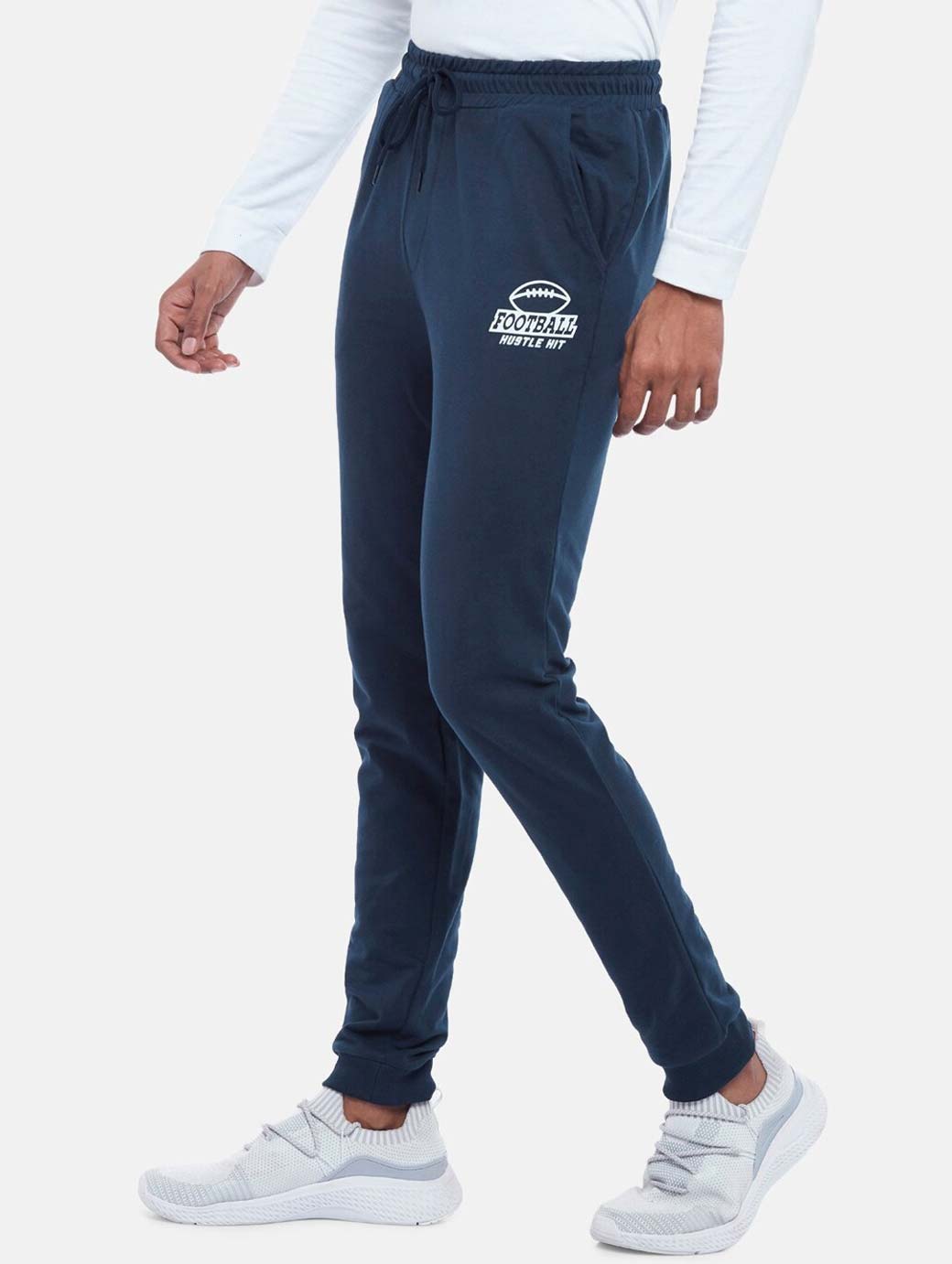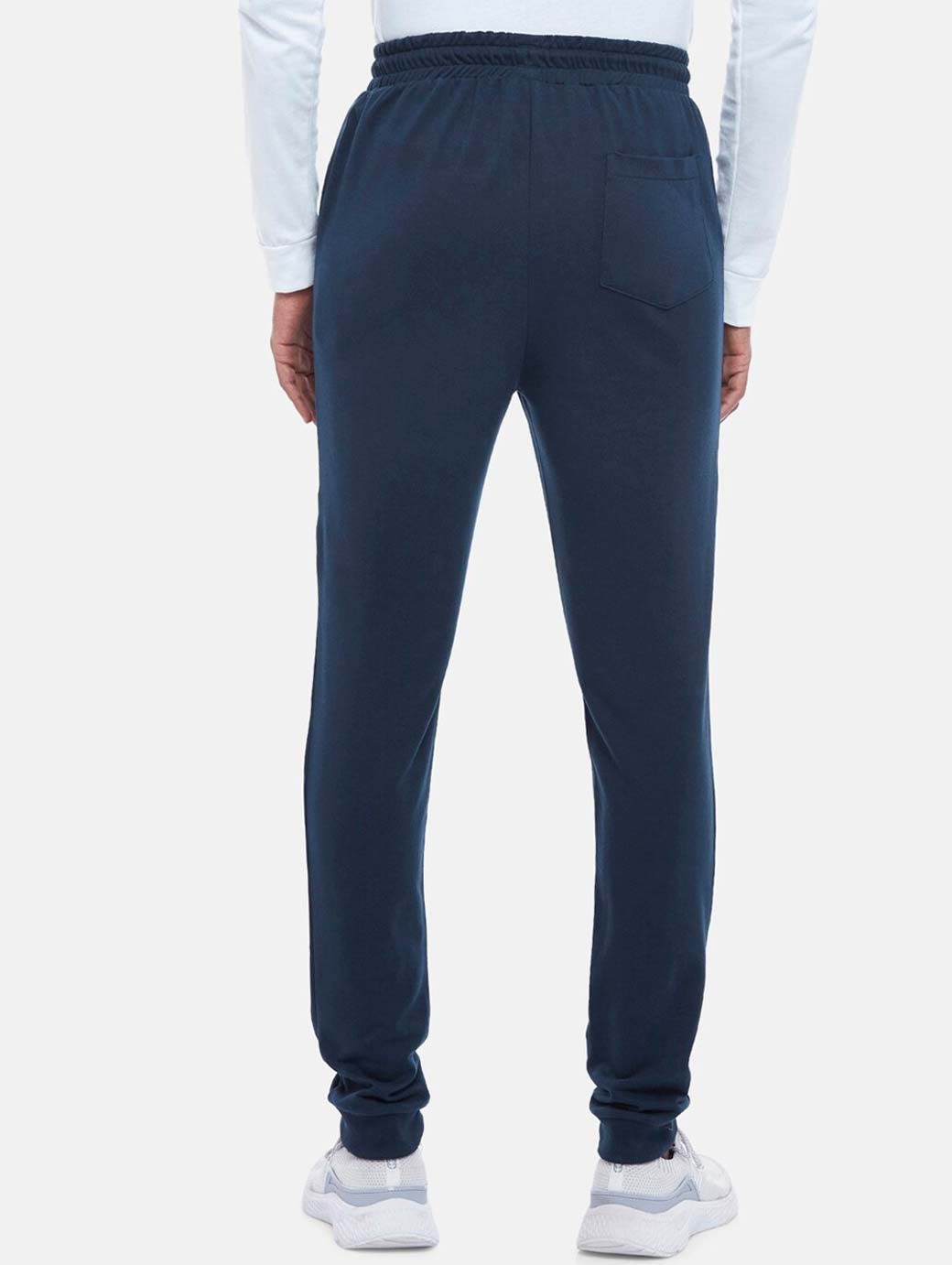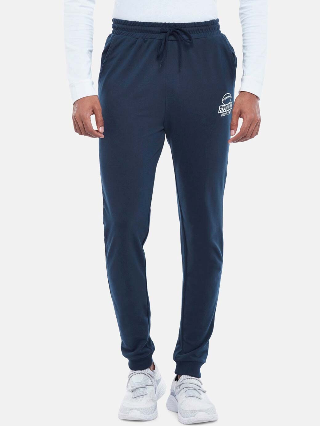Navy blue solid slim-fit joggers, has an elasticated waistband with drawstring closure, 3 pockets and cuffed hems