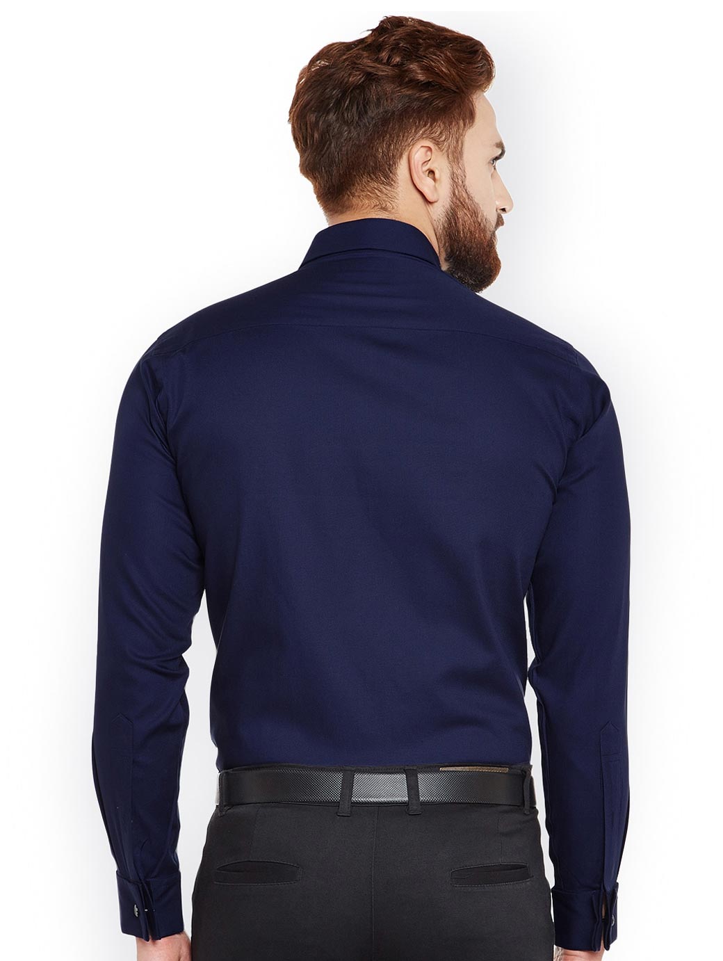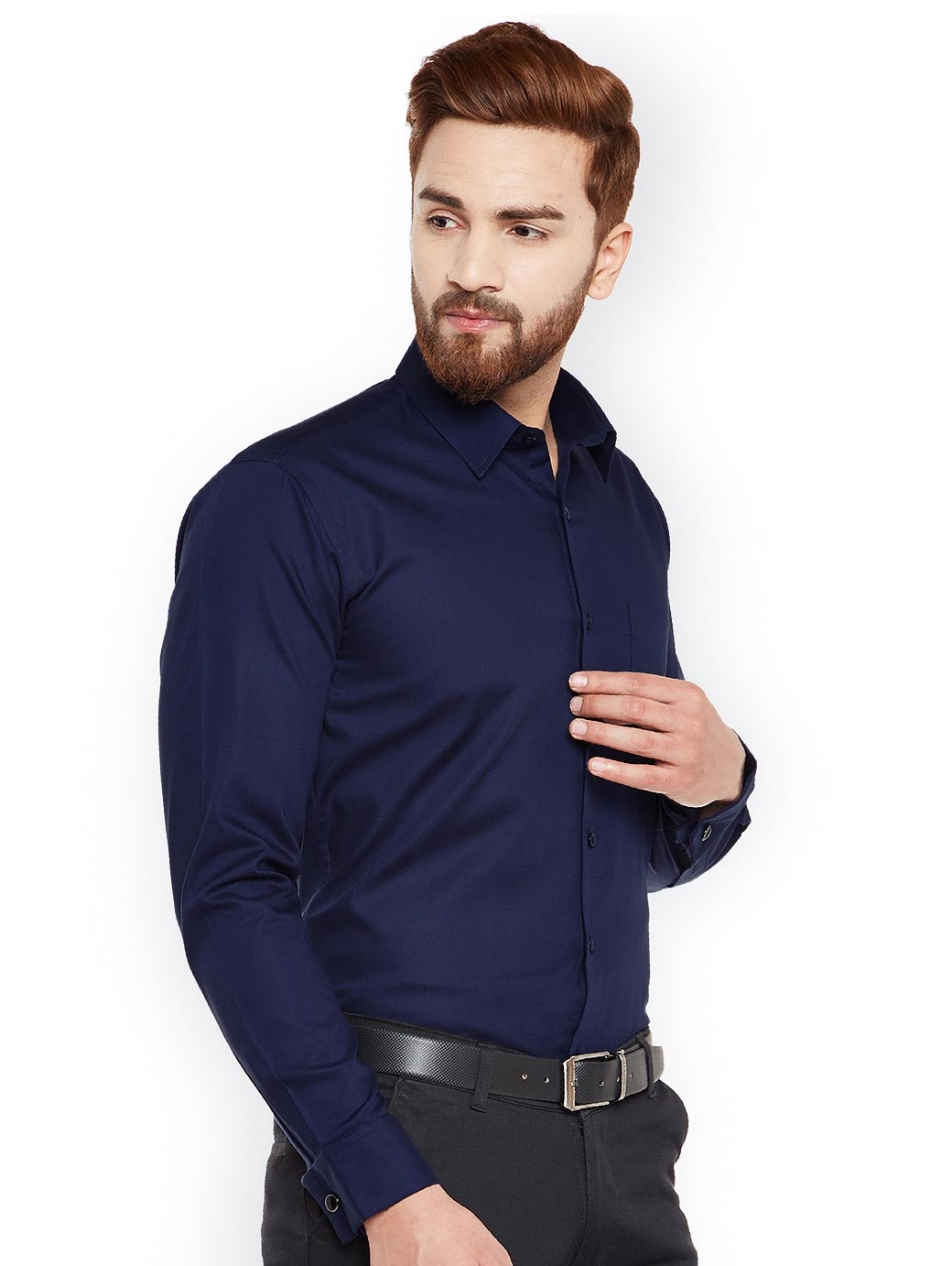 Navy Blue solid formal shirt, has a spread collar, long sleeves, straight hem, one patch pocket, french cuffs