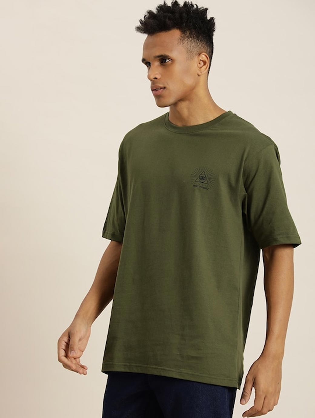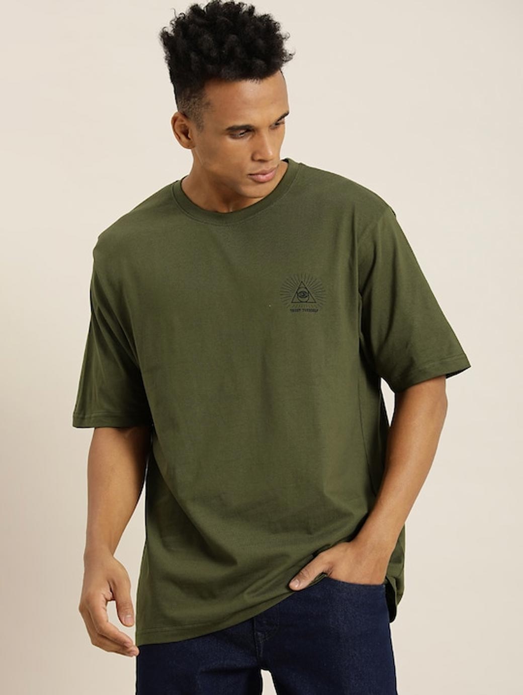 Olive green Tshirt for men Graphic printed Longline length Round neck Short, regular sleeves Knitted pure cotton fabric