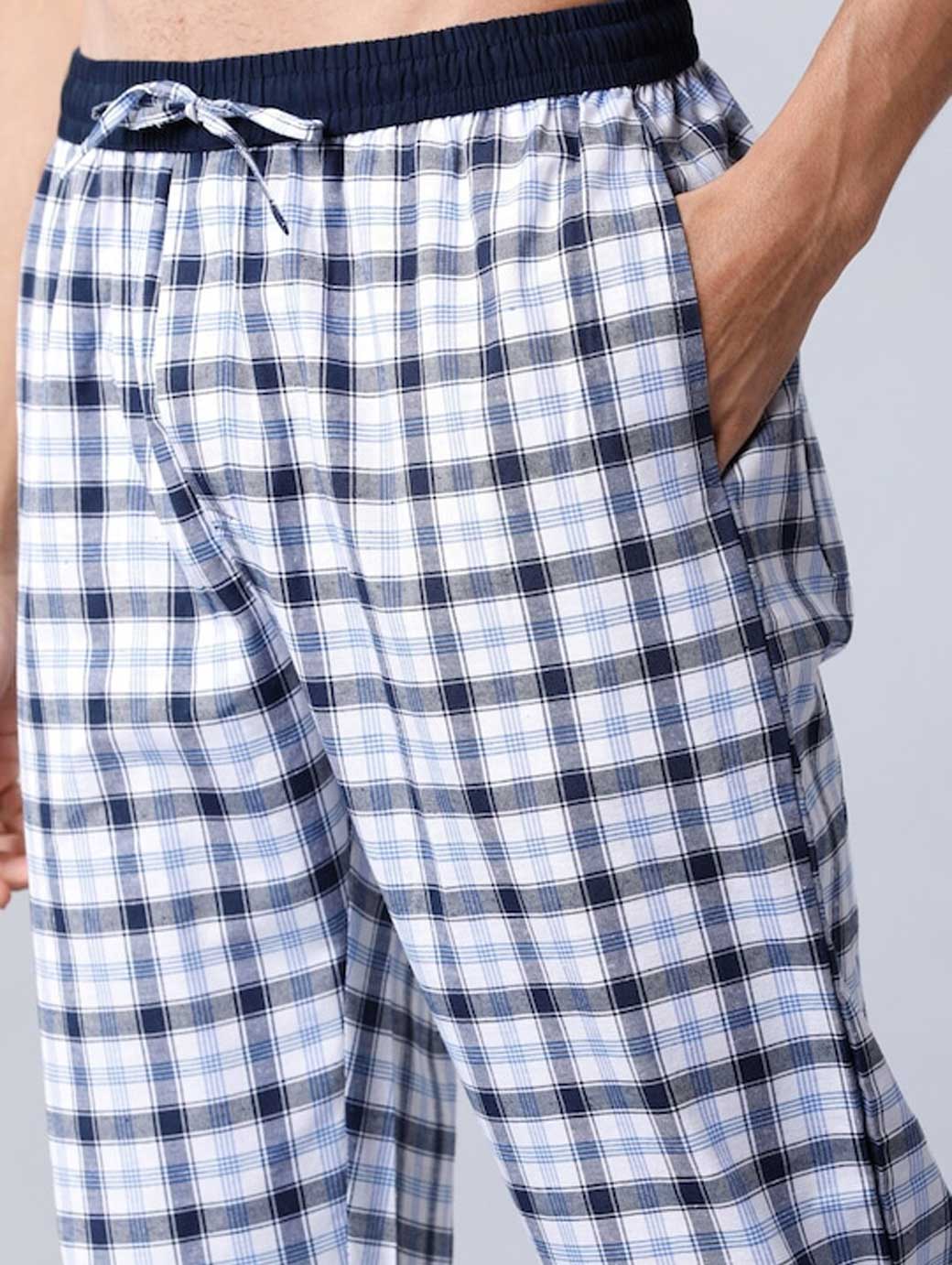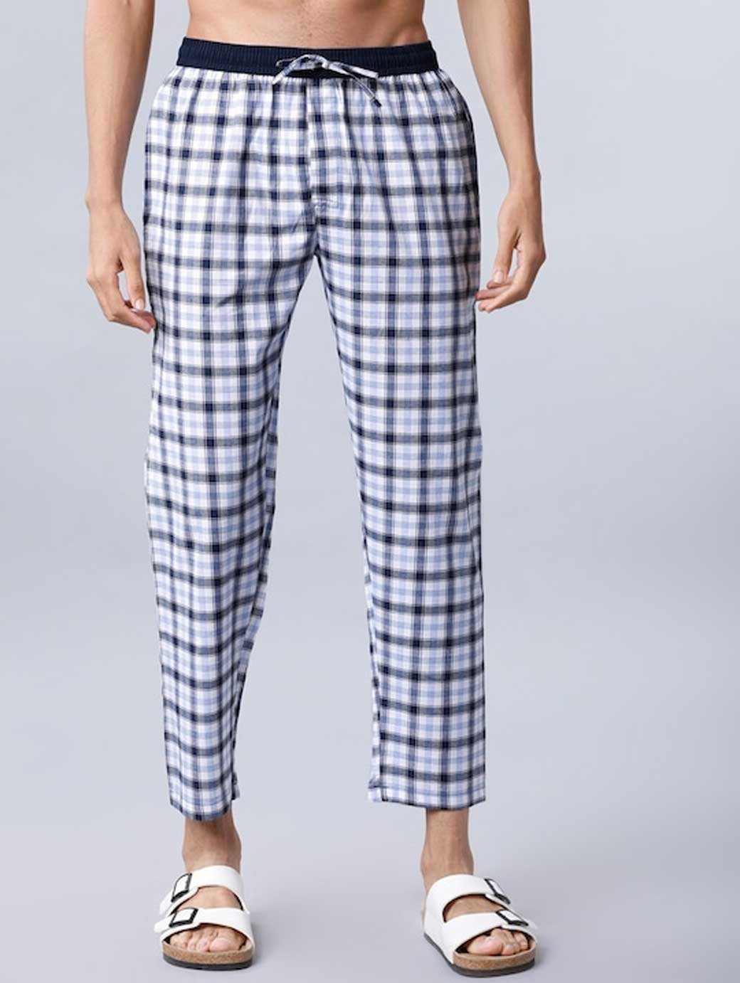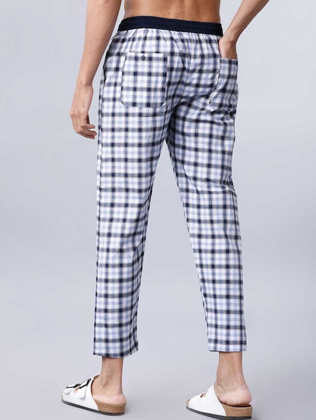 White and navy blue checked mid-rise cropped lounge pants, has an elasticated waistband with a drawstring fastening, two pockets