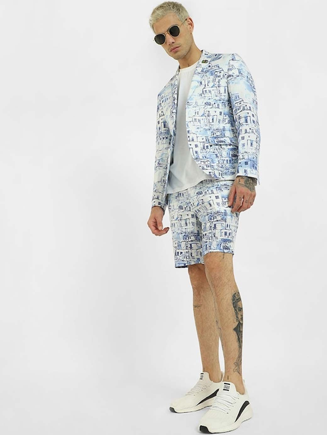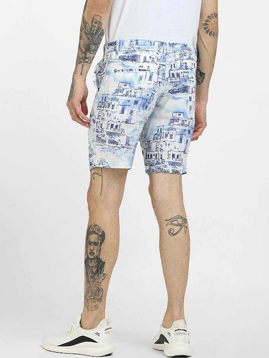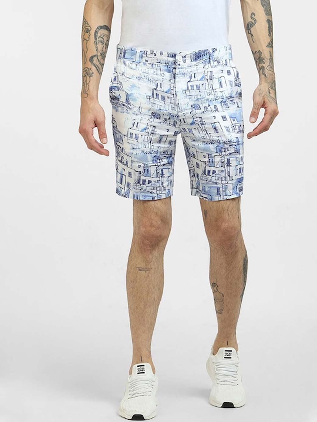 White solid printed low-rise regular shorts, has 4 pockets, drawstring closure