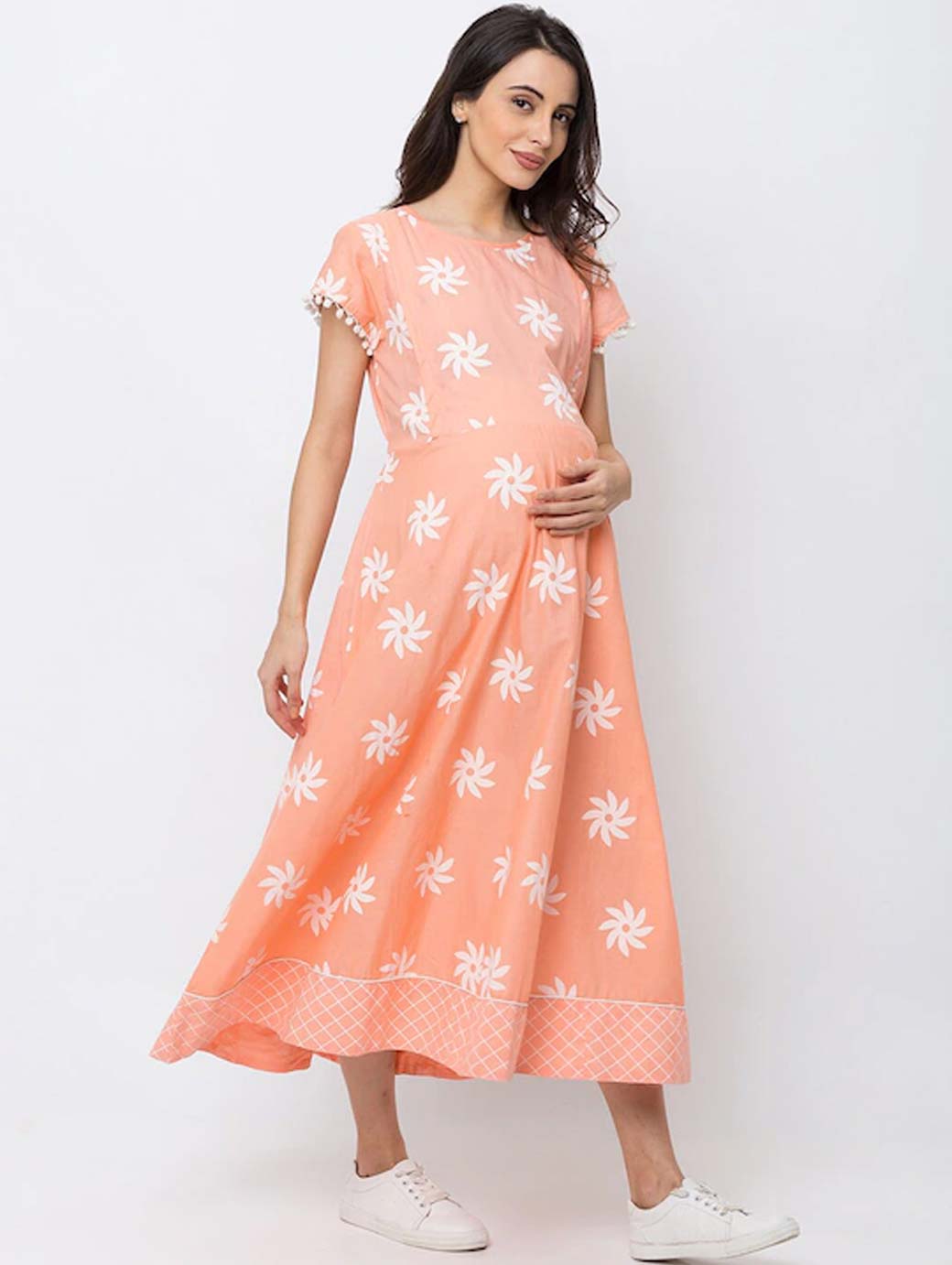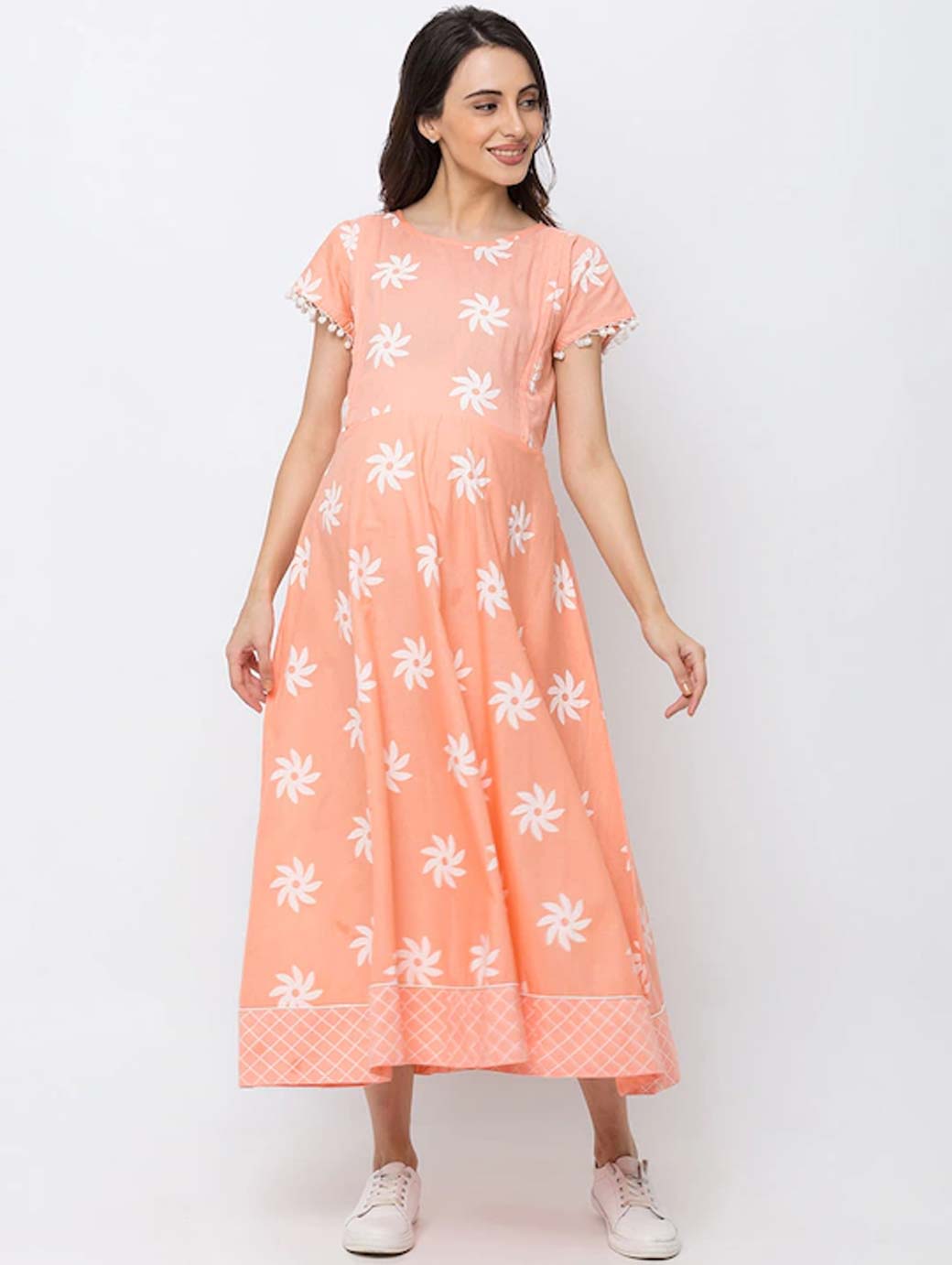 Peach-Coloured Printed Fit and Flare Maternity Feeding Nursing Dress