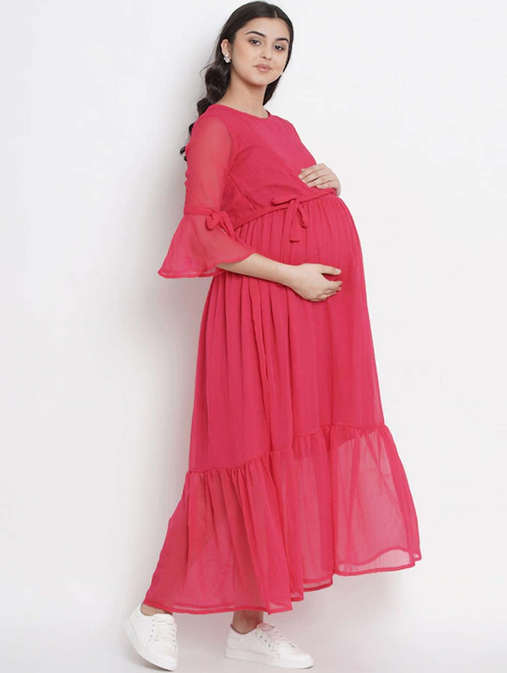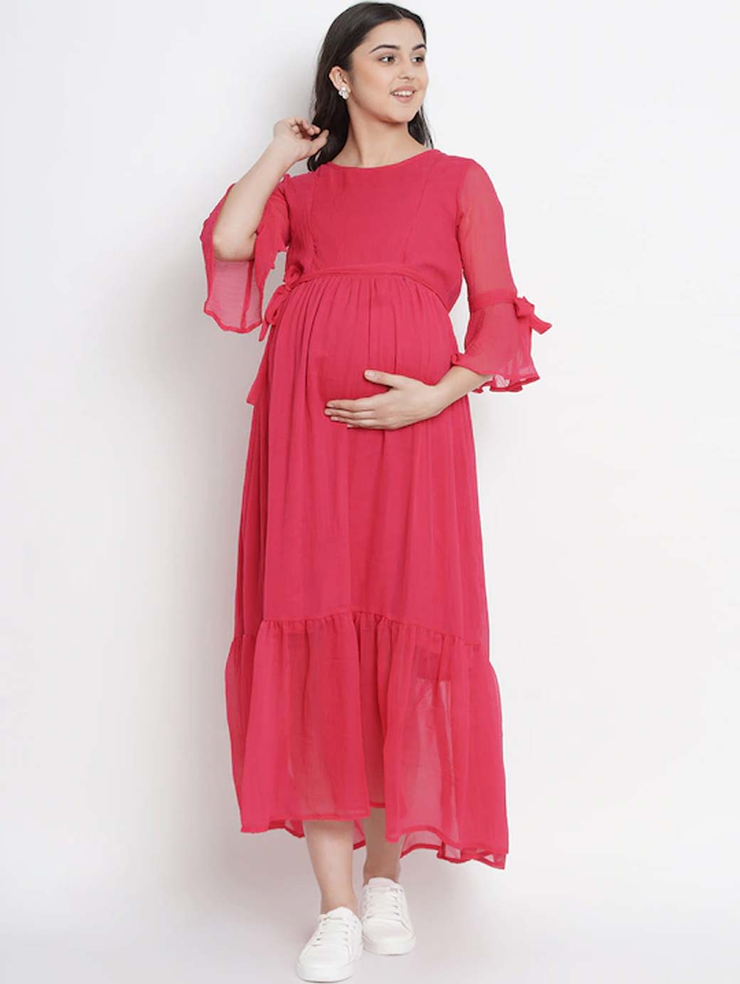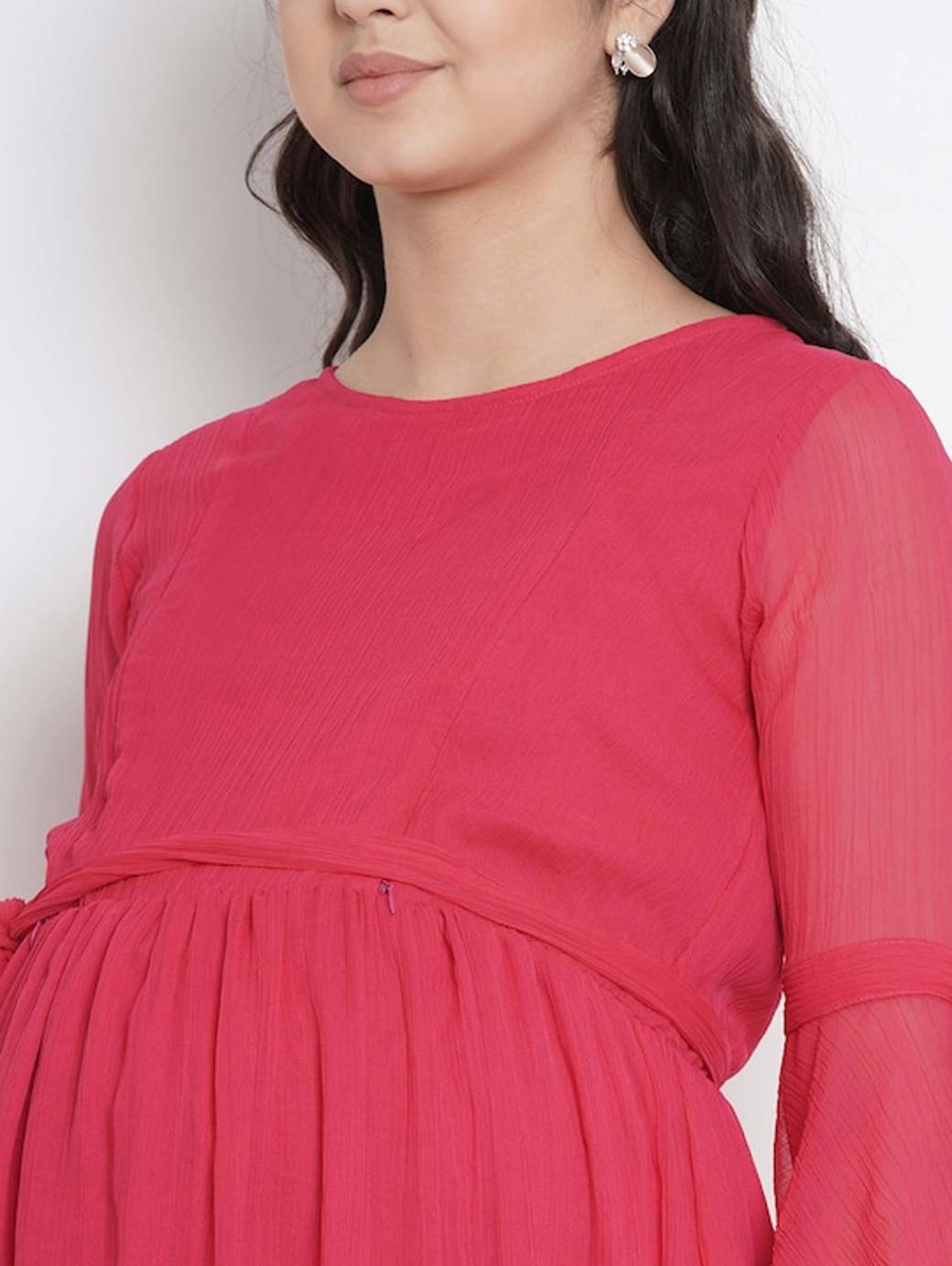 Fuchsia pink solid woven maternity fit and flare dress, has a round neck, three-quarter sleeves, an attached lining, and flounce hem