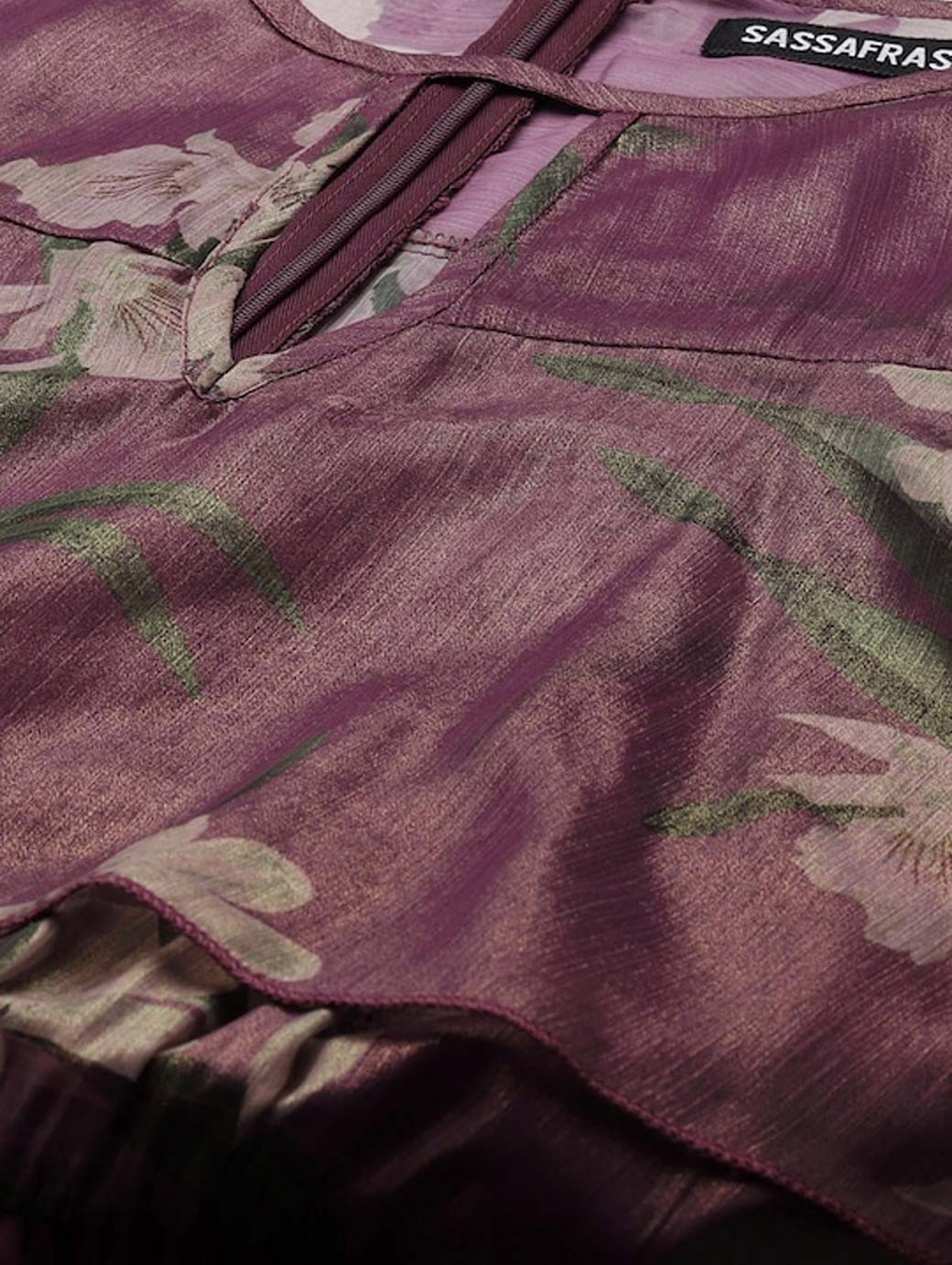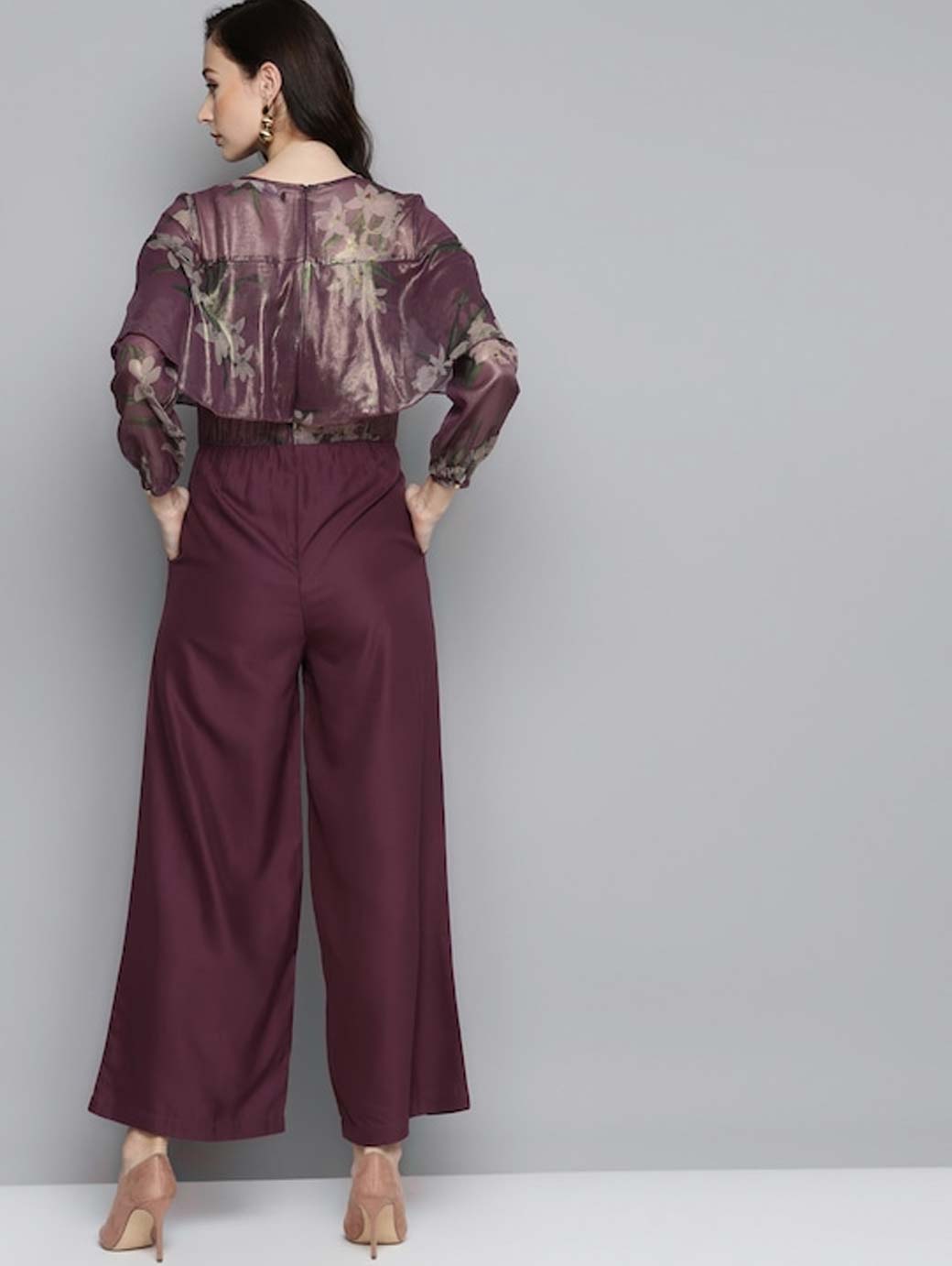Purple and beige printed basic jumpsuit with gathers ,has a round neck, long sleeves, 2 pockets