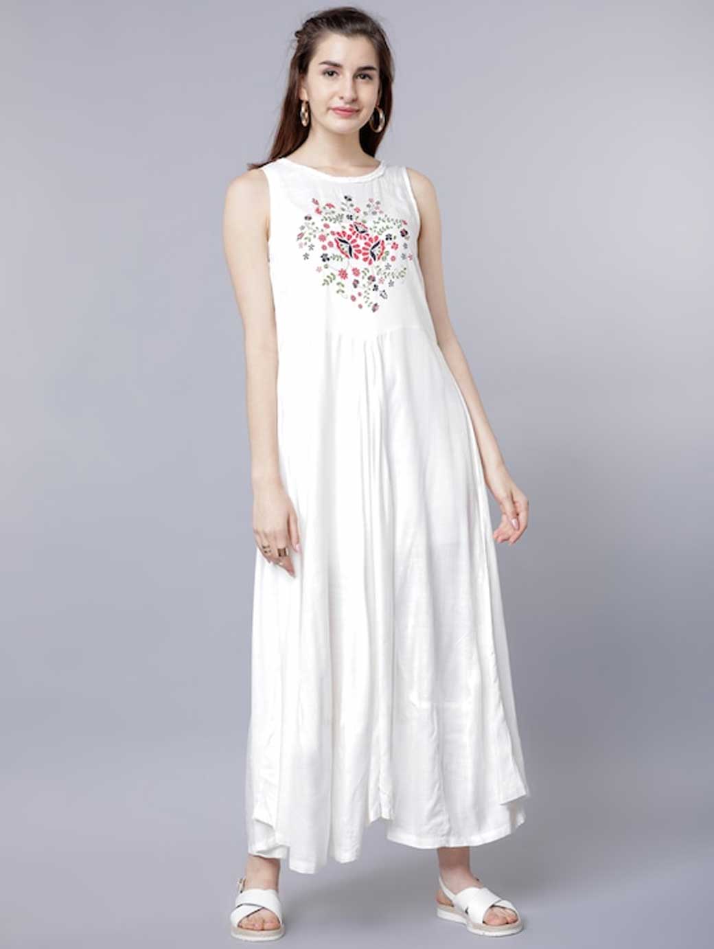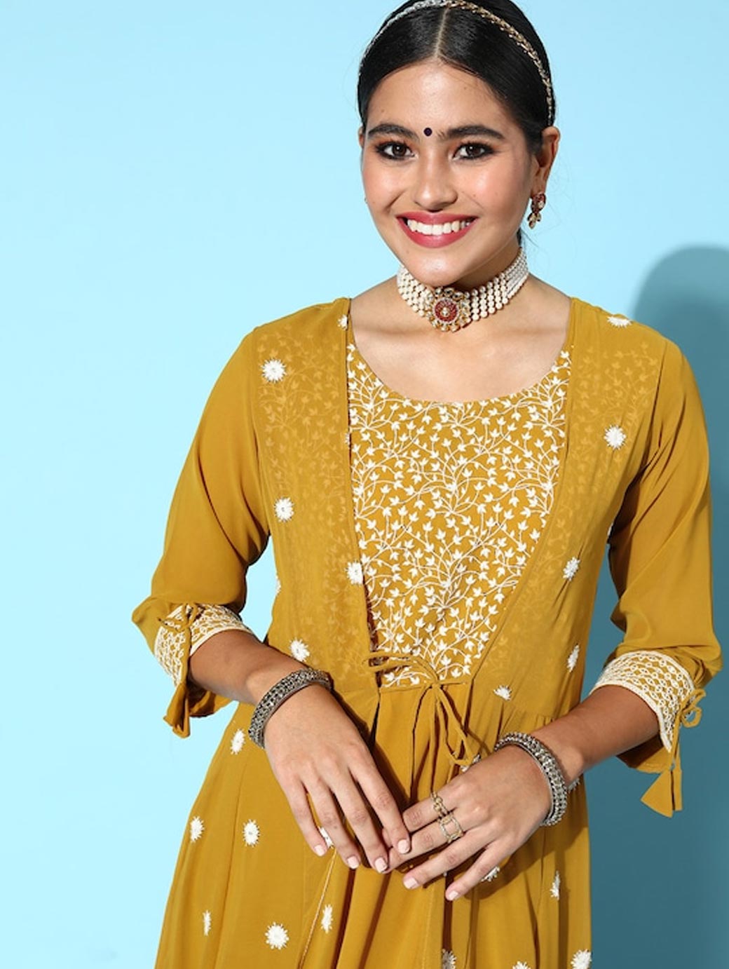 White and navy blue floral print a-line dress Mandarin collar Three-quarter, regular sleeves Layered detail Maxi length in flared hem Comes with a open front checked jacket