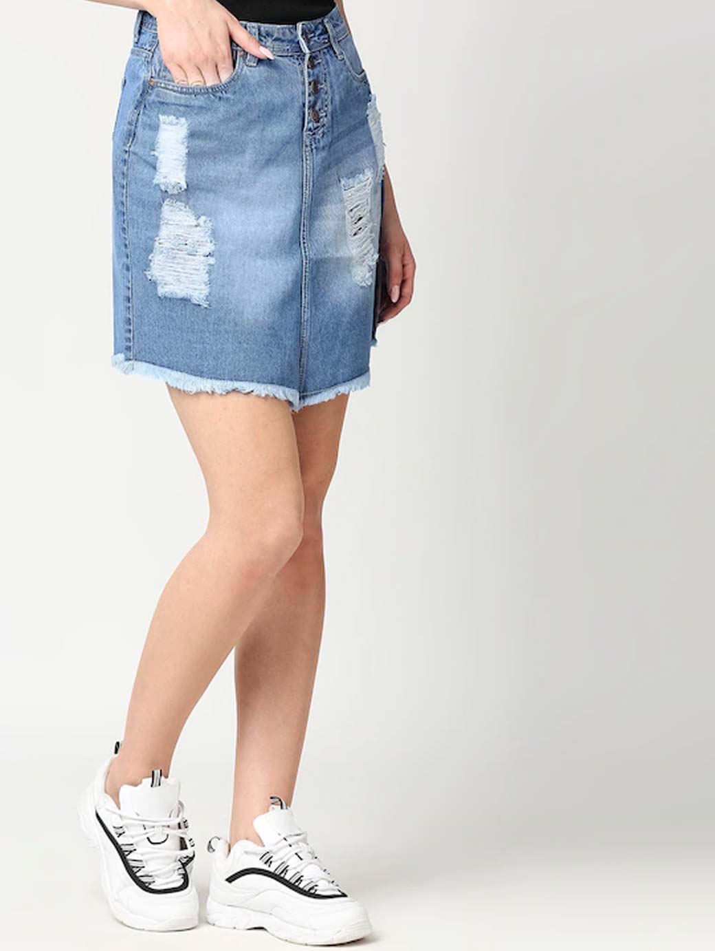 Women Blue Solid Distressed A-Line Mini Denim Skirt