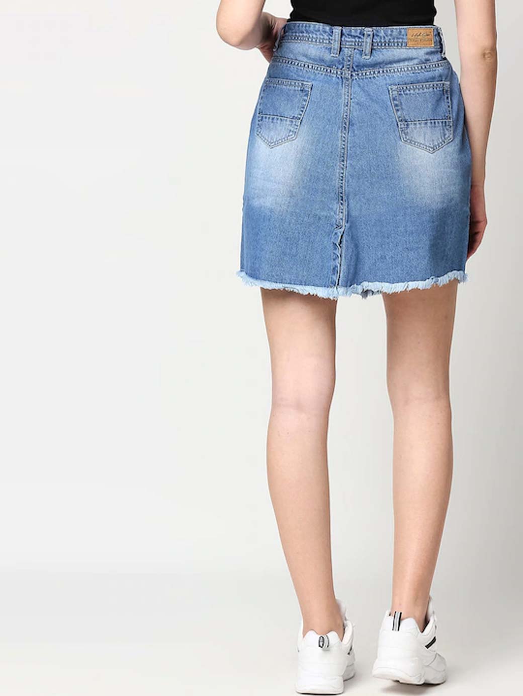 Blue solid distressed A-line mini denim skirt, has a waistband with button closure, back slit, and frayed curved hem, 5 pockets