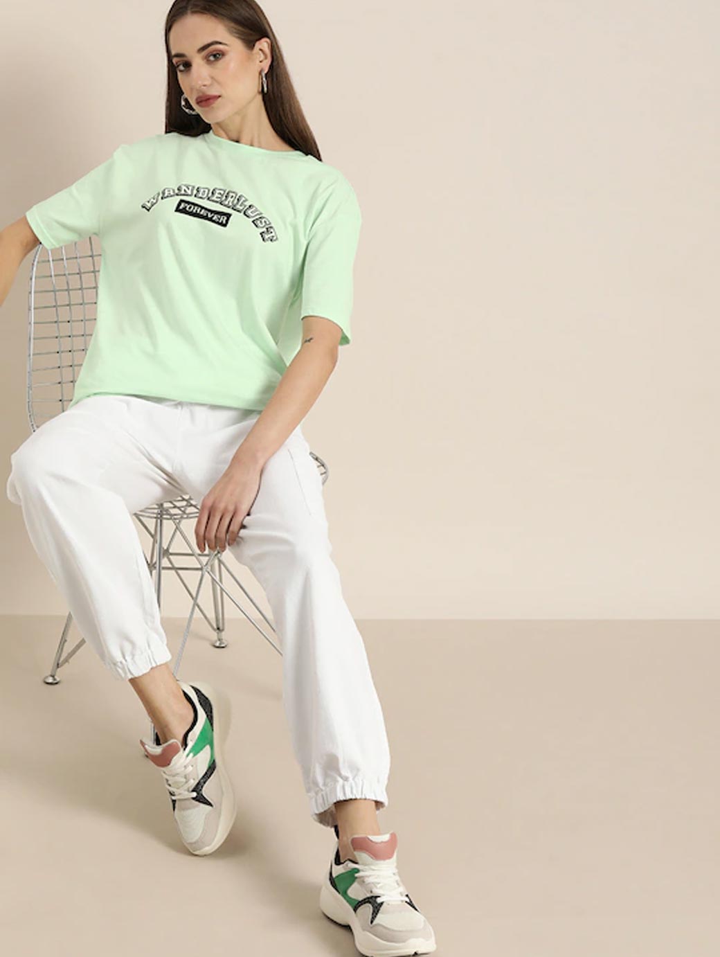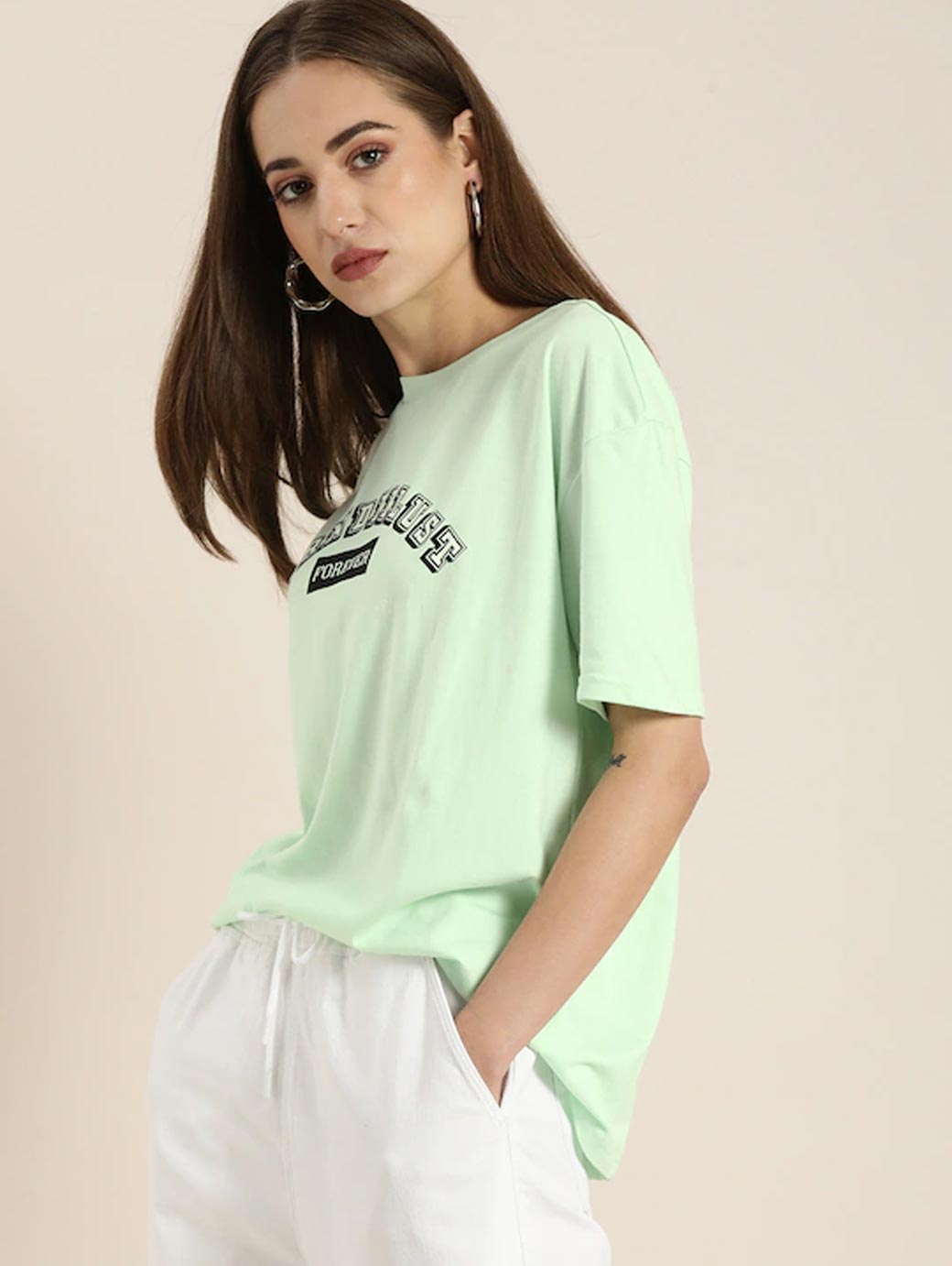 Green and black Tshirt for women, Typography printed, Regular length, Round neck, Short, extended sleeves, Knitted cotton fabric.
