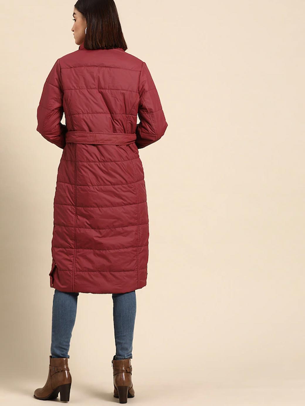 Women Maroon Longline Hooded Parka Jacket with Belt