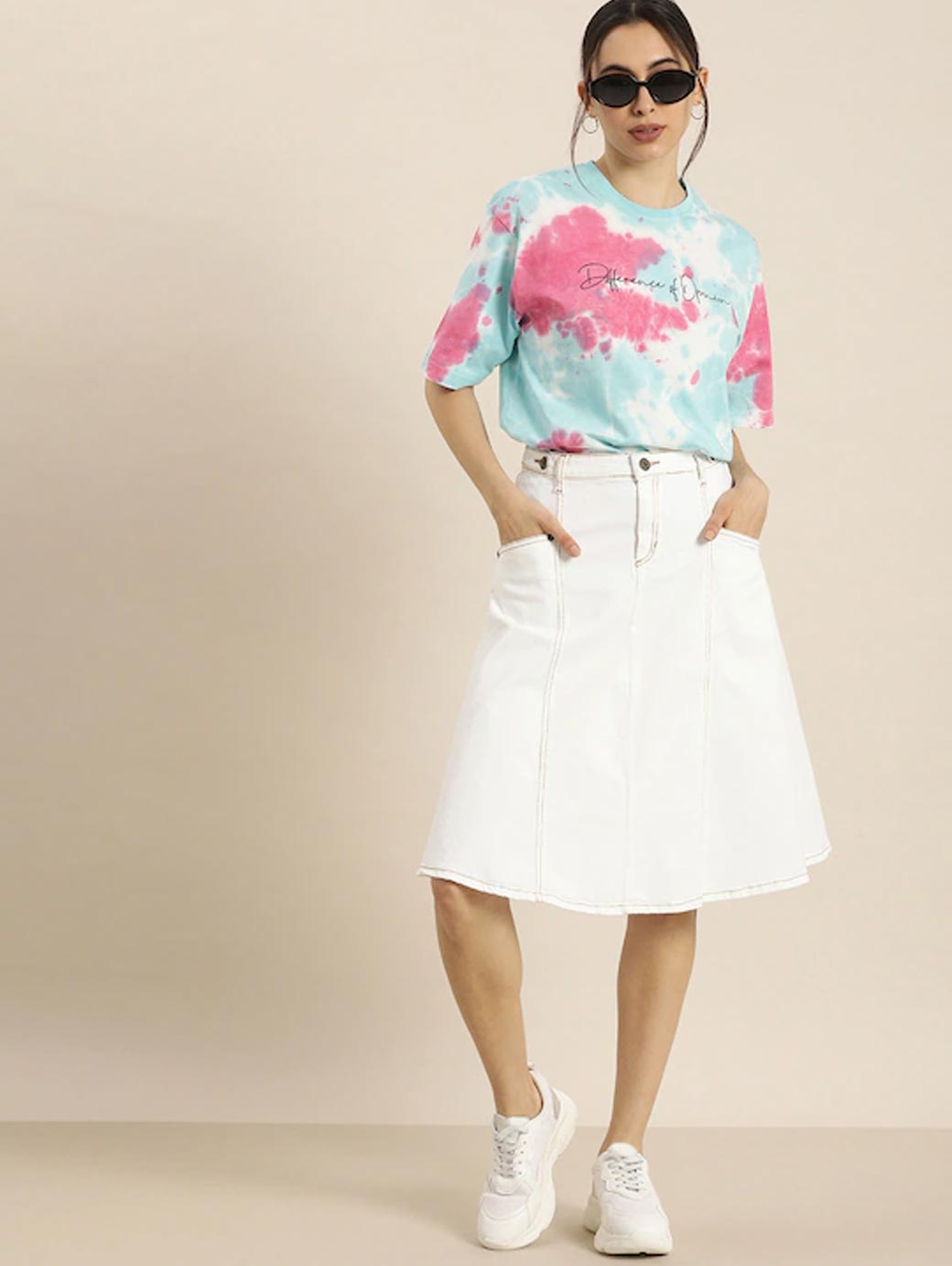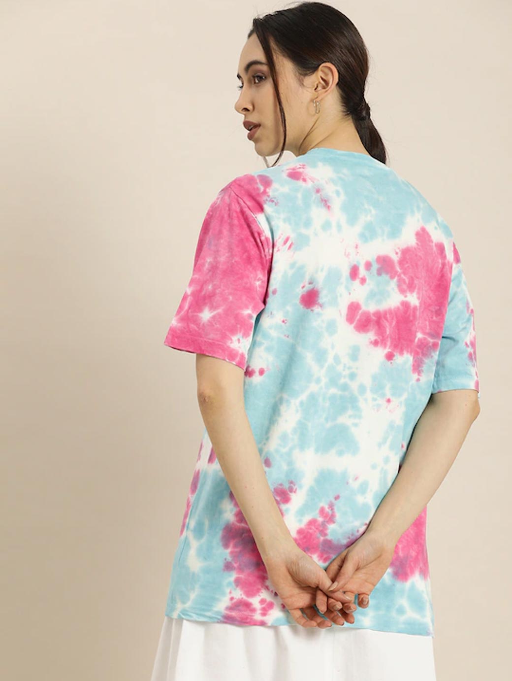 Multicoloured Tshirt for women, Tie and dye dyed, Longline length, Round neck, Short, regular sleeves, Knitted cotton fabric.