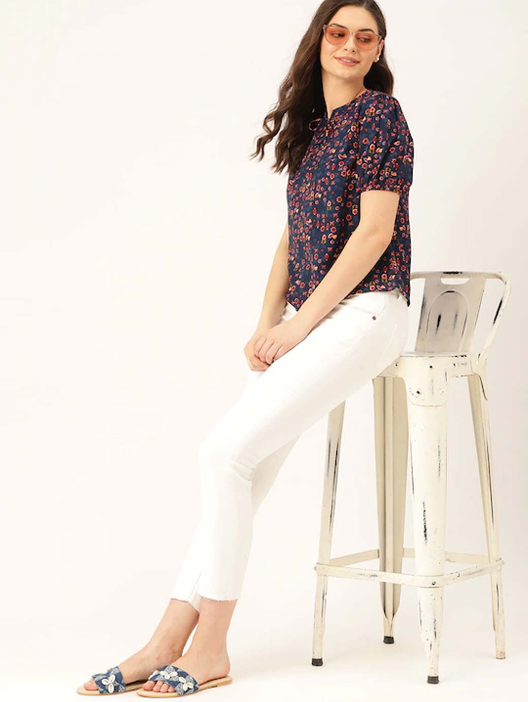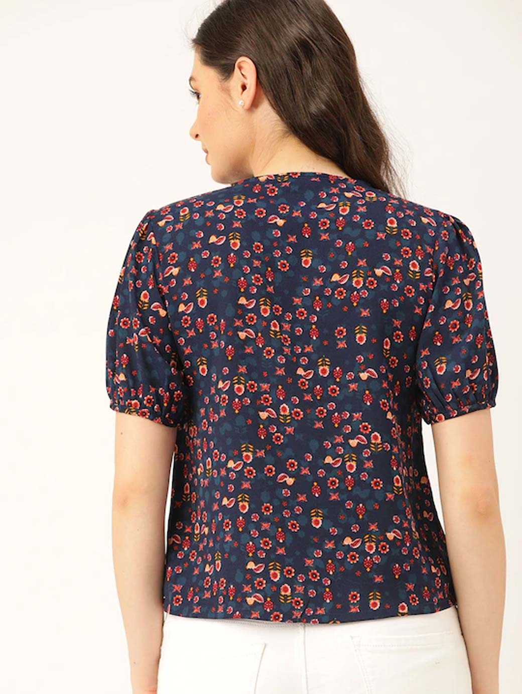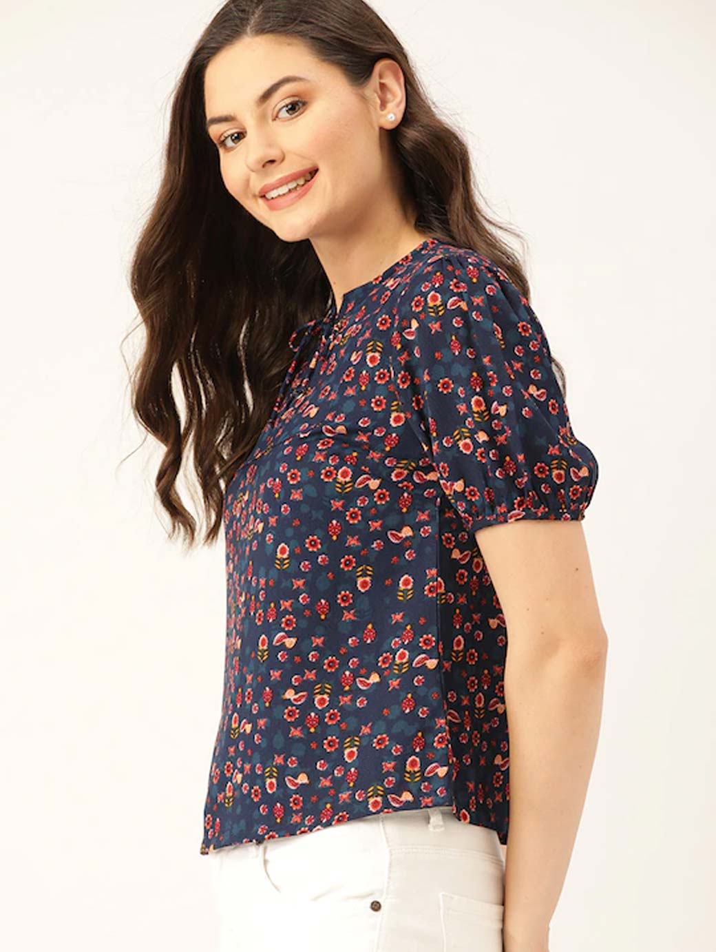 Navy blue and orange floral print woven regular top with lace-up detail, has a tie-up neck, and short sleeves