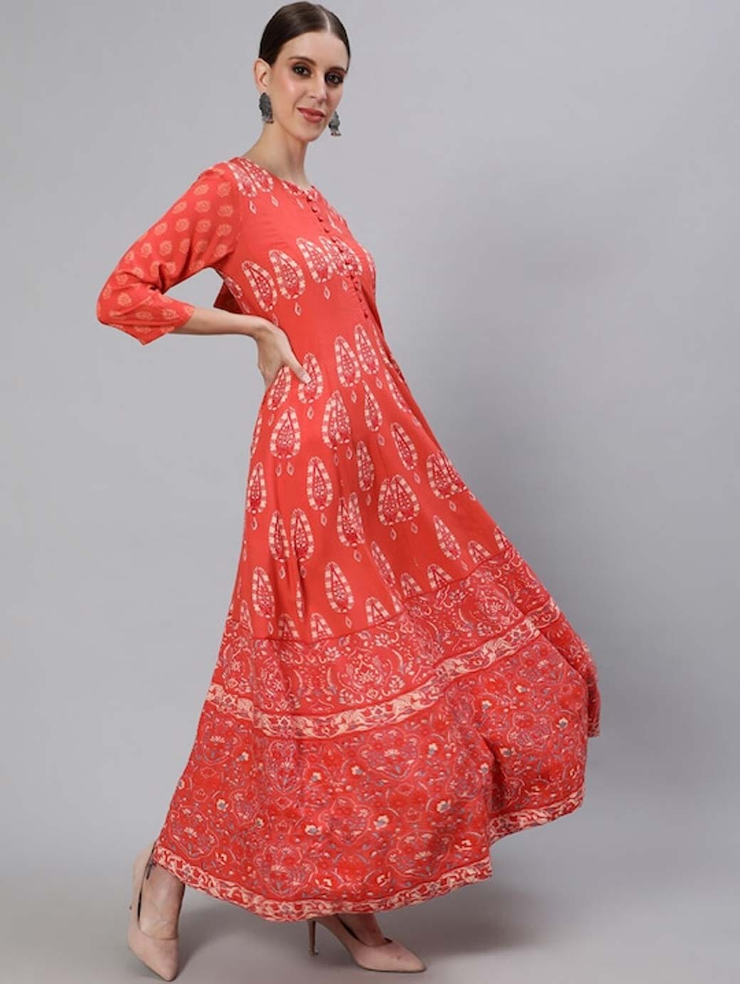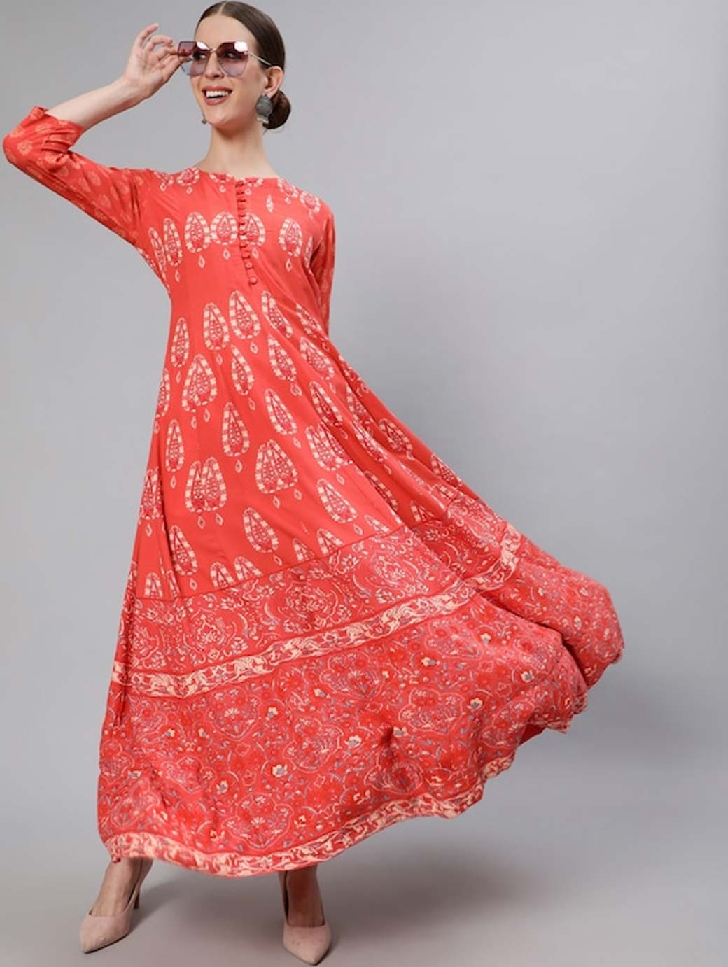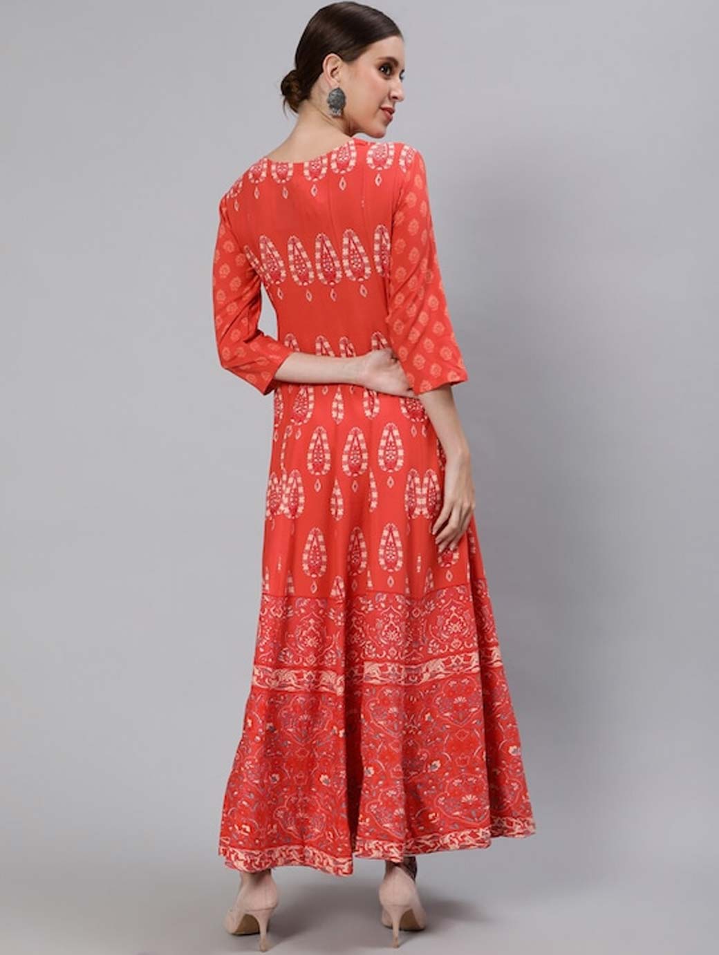 Peach-coloured and white Geometric printed Keyhole neck Three-quarter, regular sleeves Anarkali shape with empire style Ankle length with flared hem Machine weave regular cotton