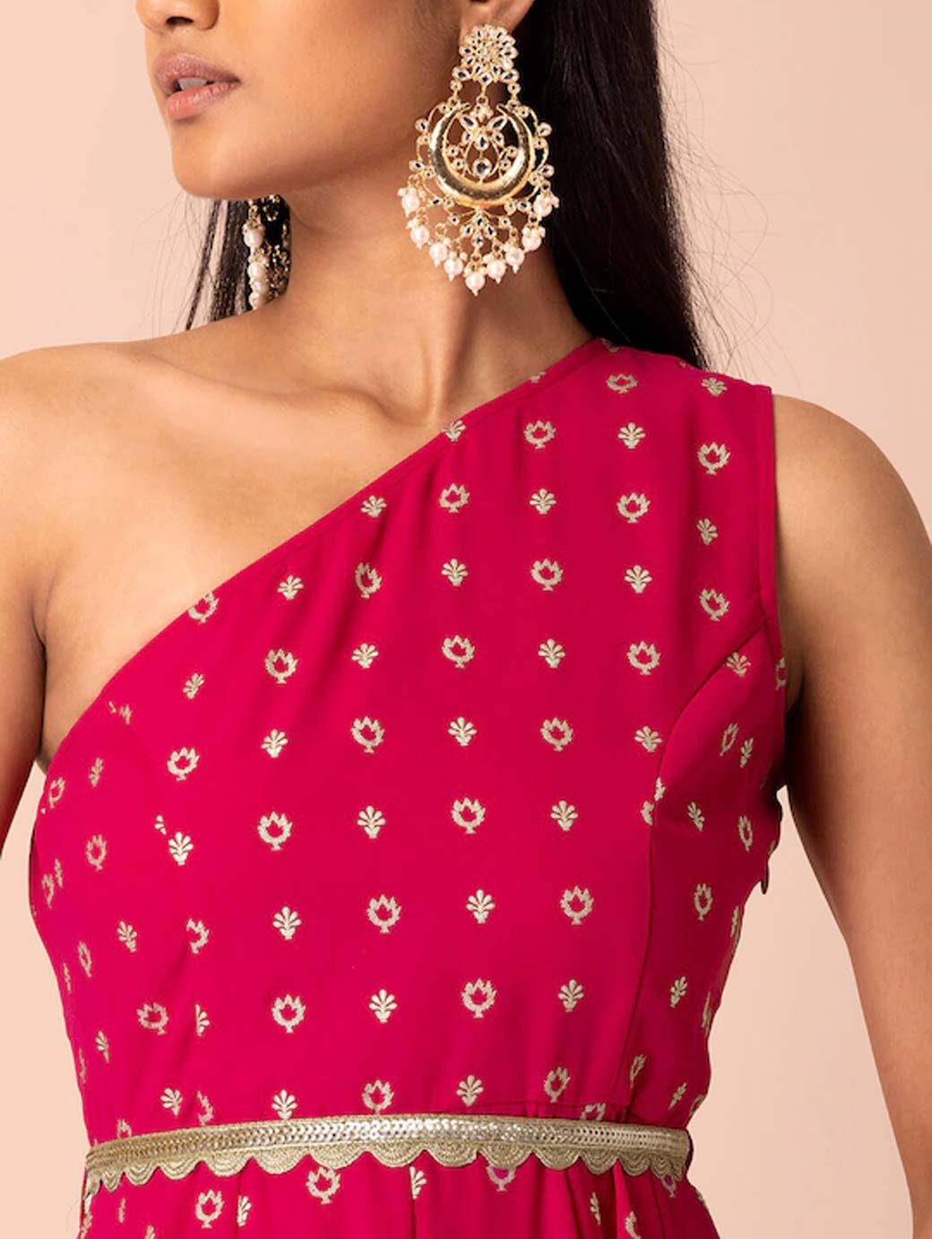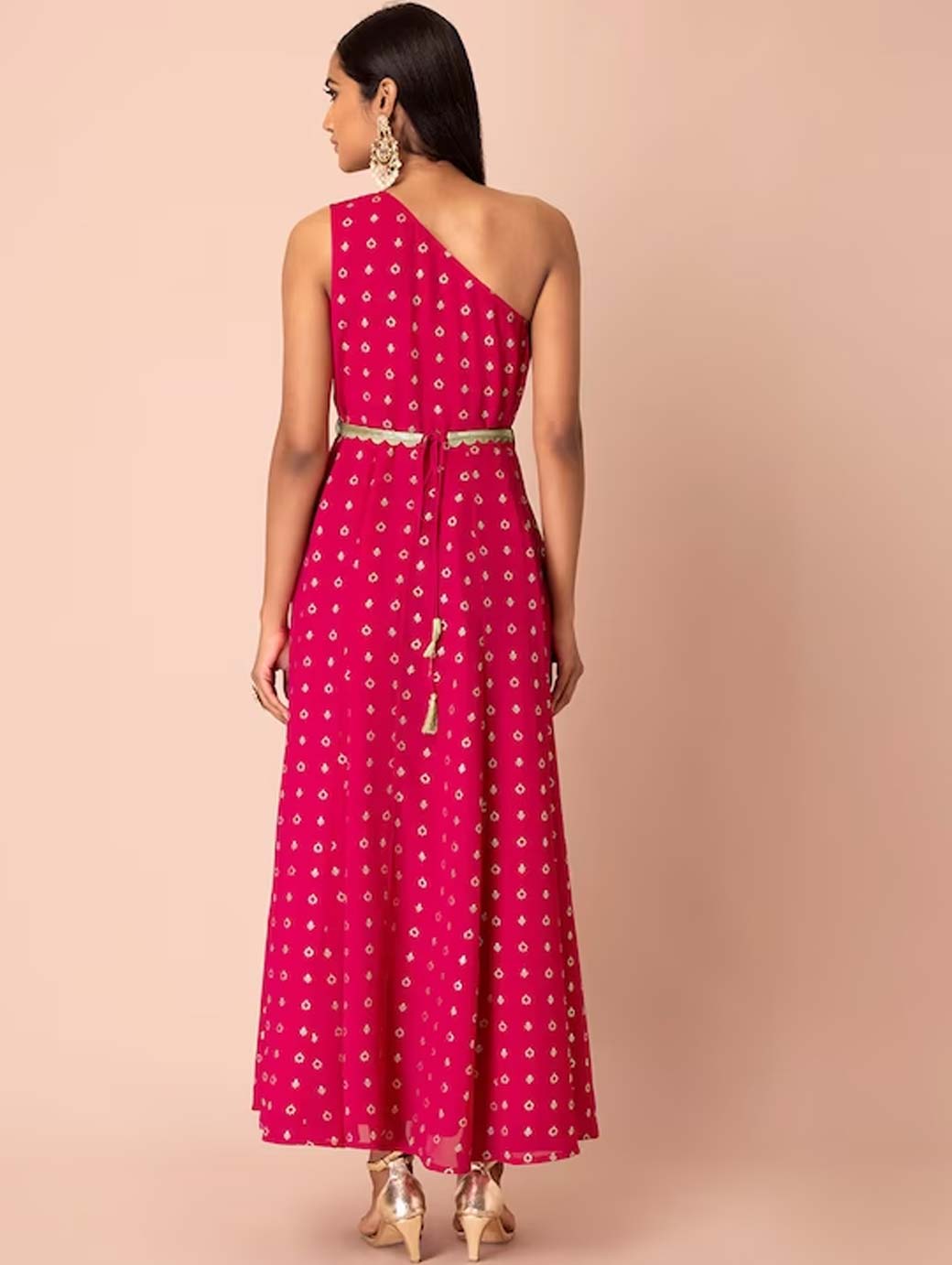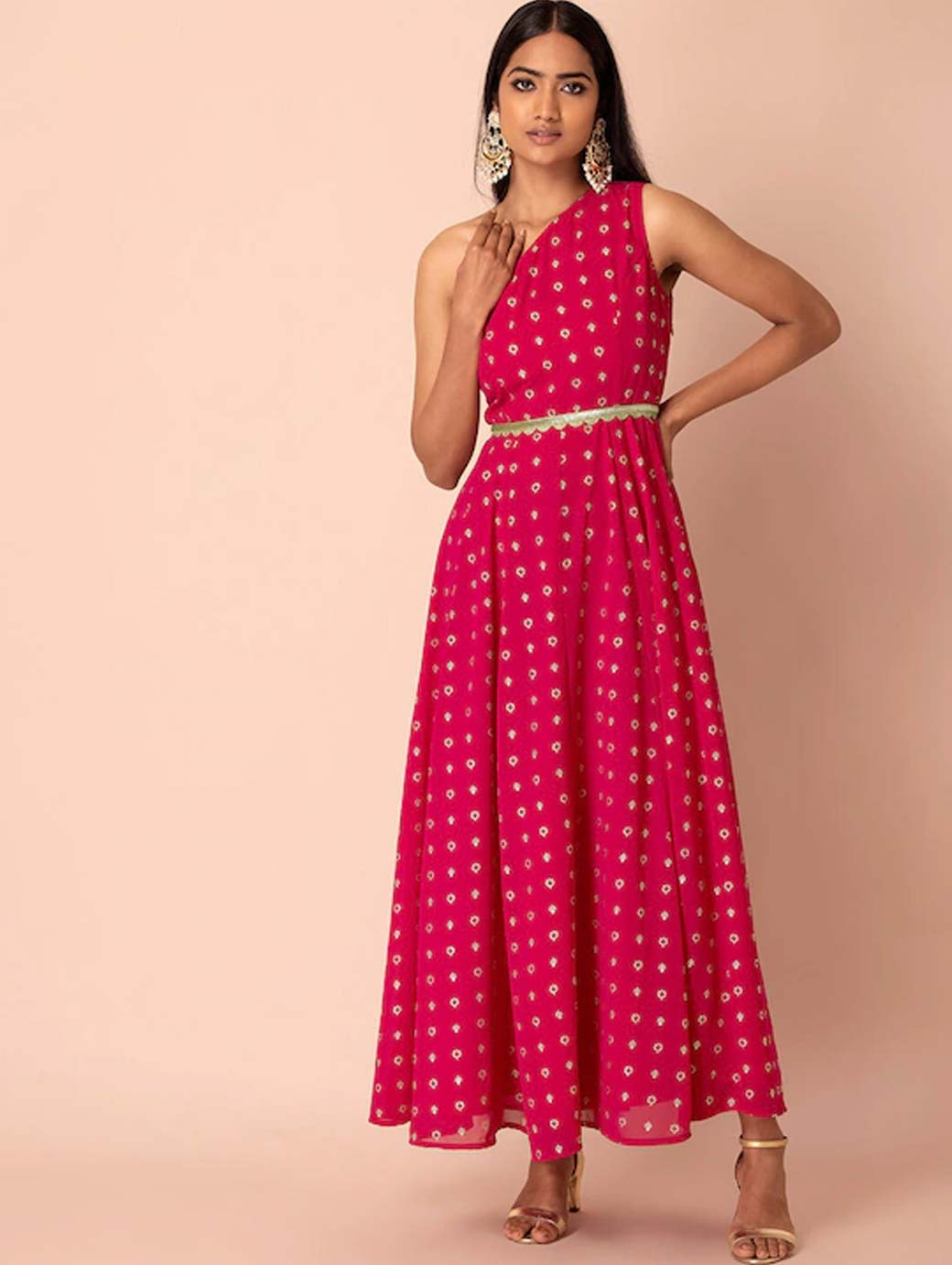 Pink printed ethnic dress, has one shoulder sleeves, belted waist