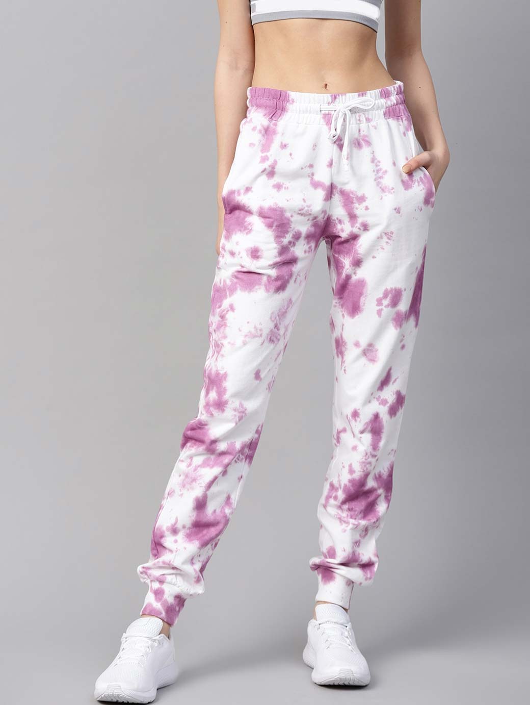 White and purple dyed joggers, has an elasticated waistband with drawstring closure, two pockets and cuffed hems