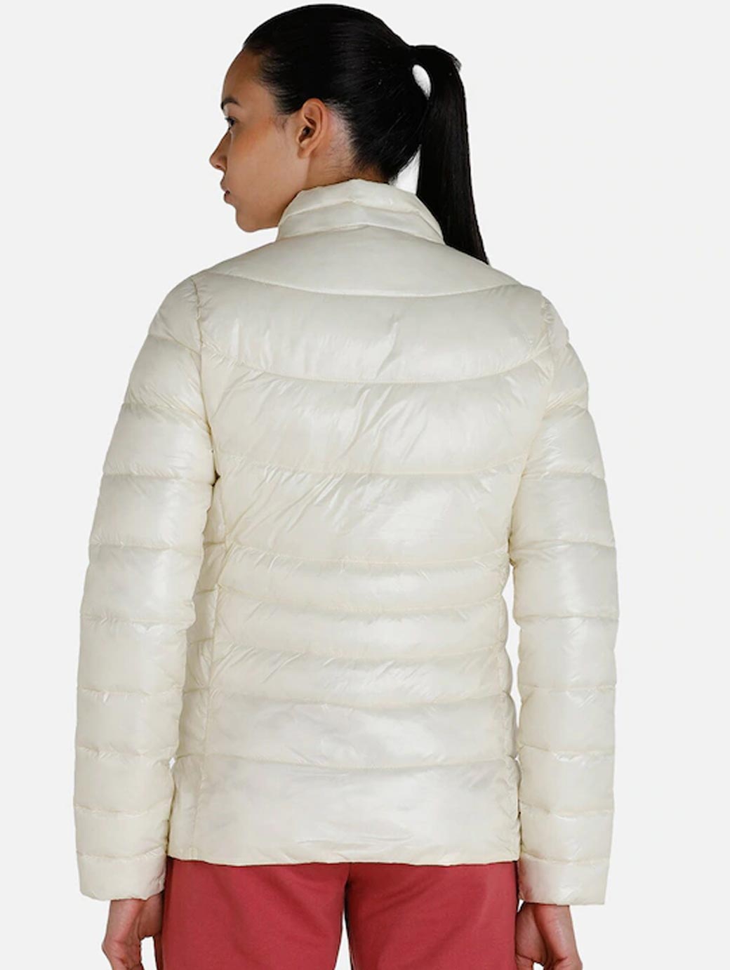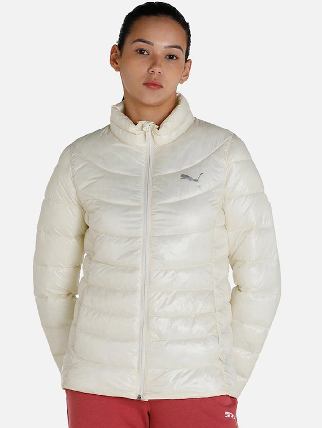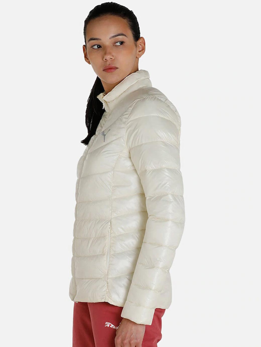 White solid puffer jacket, has a mock collar, 2 pockets ,has a zip closure, long sleeves, straight hemline, nylon lining
